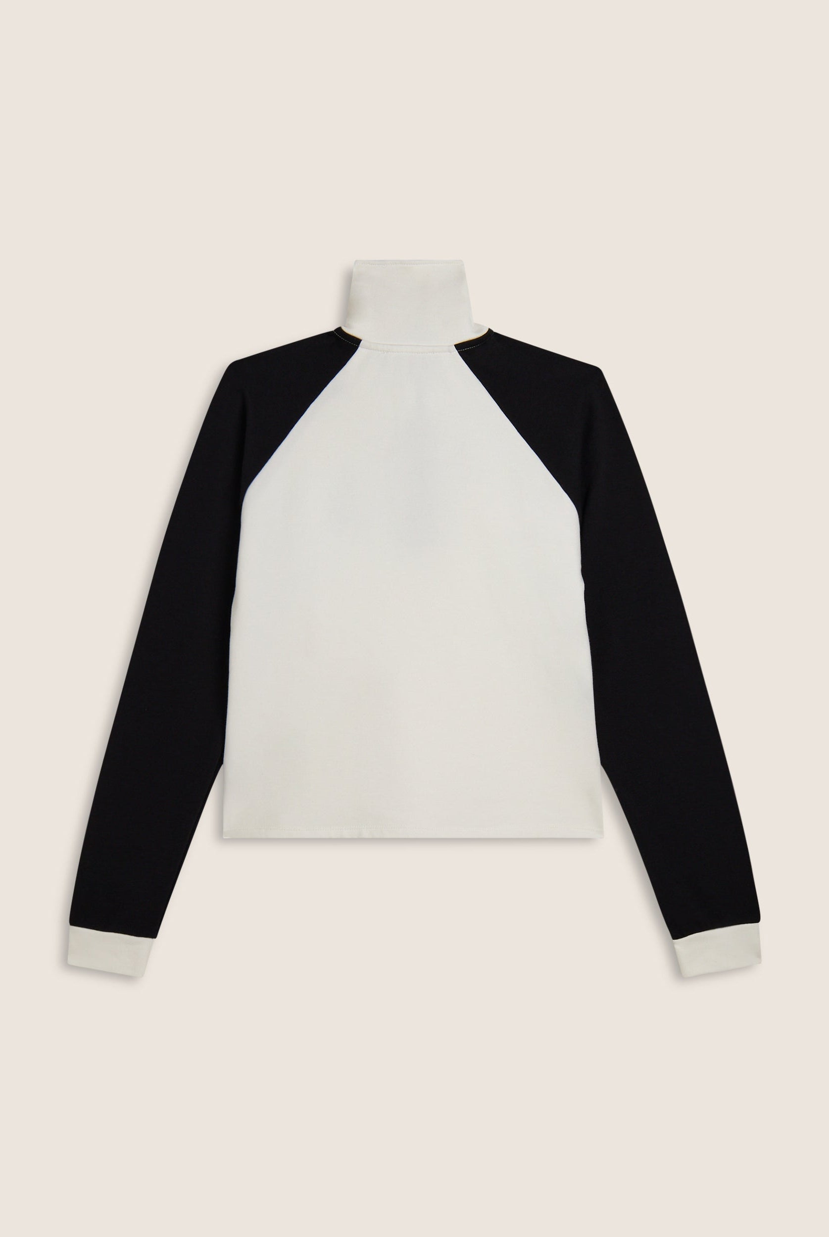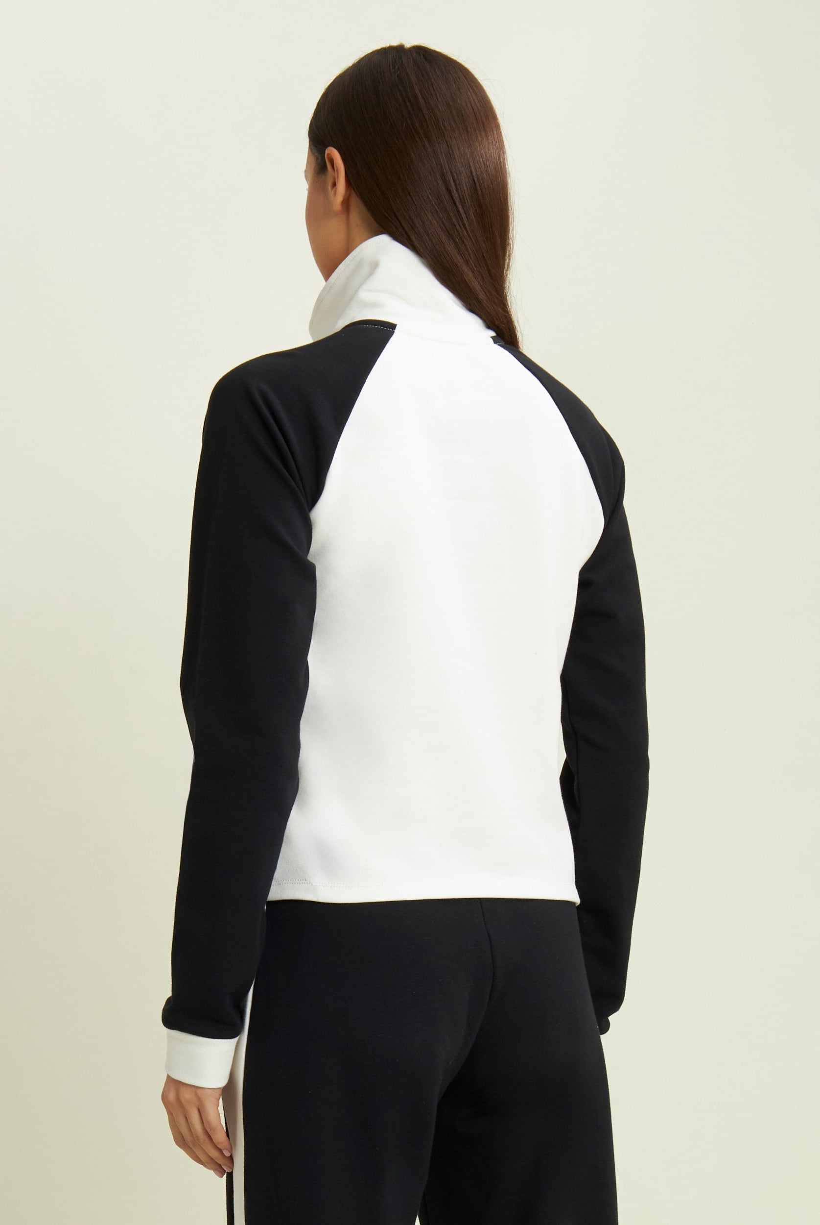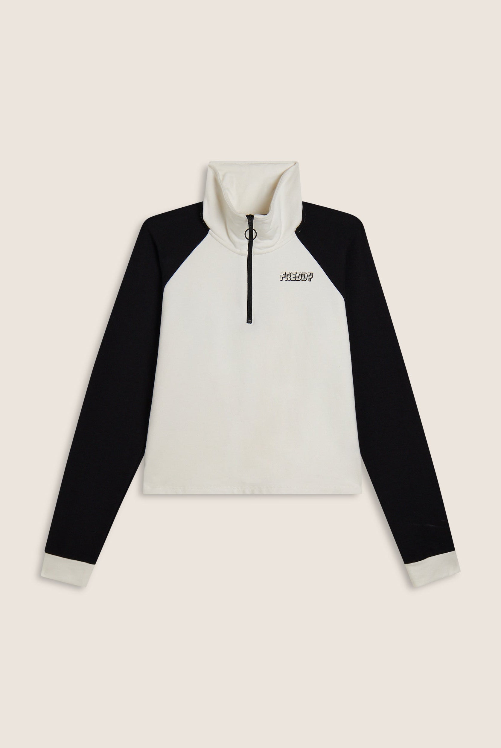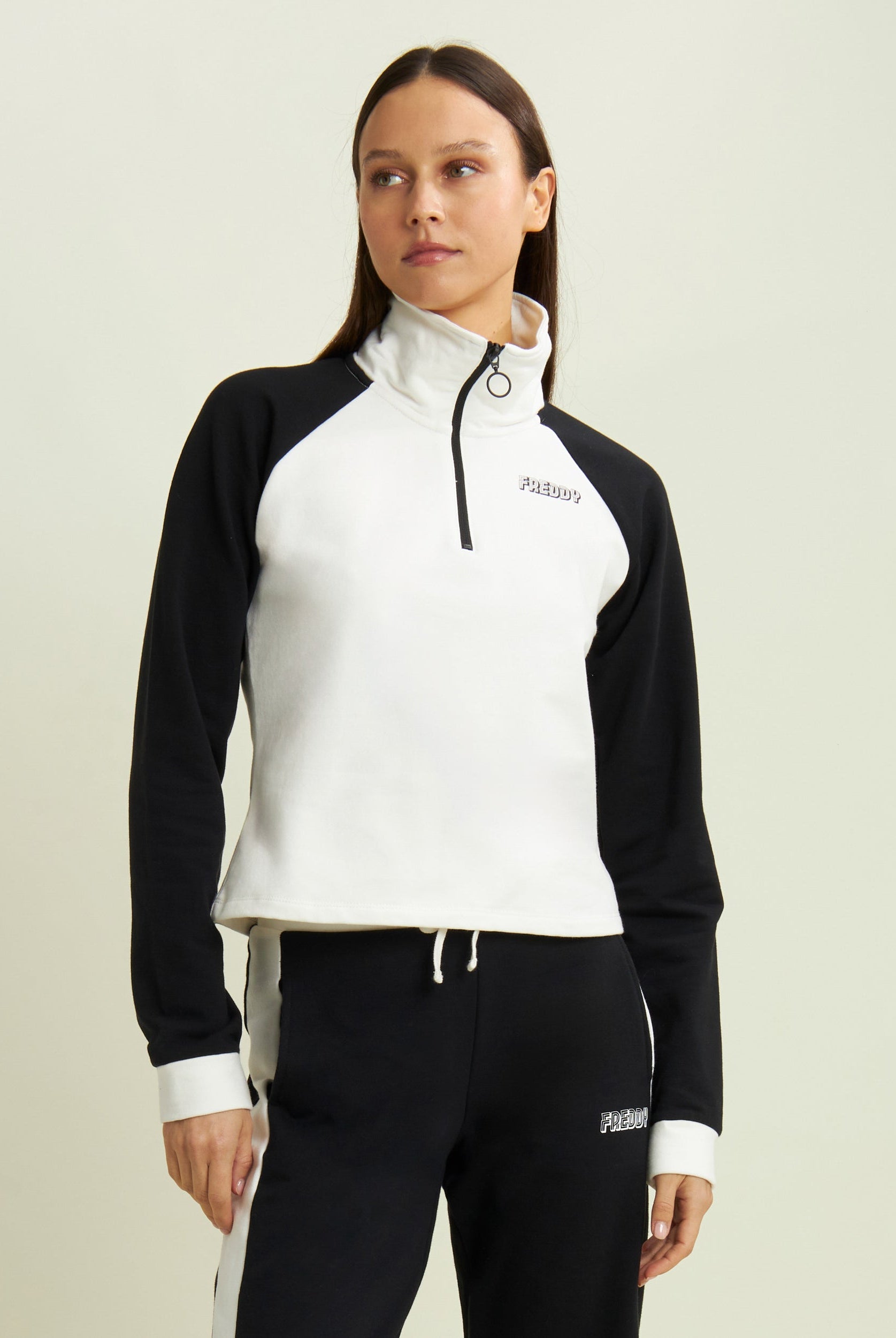 Two-tone cropped sweatshirt with half-zip and turtleneck