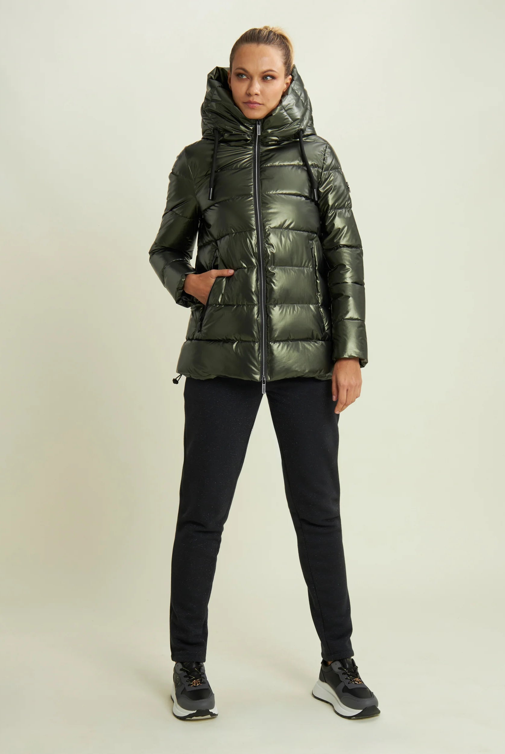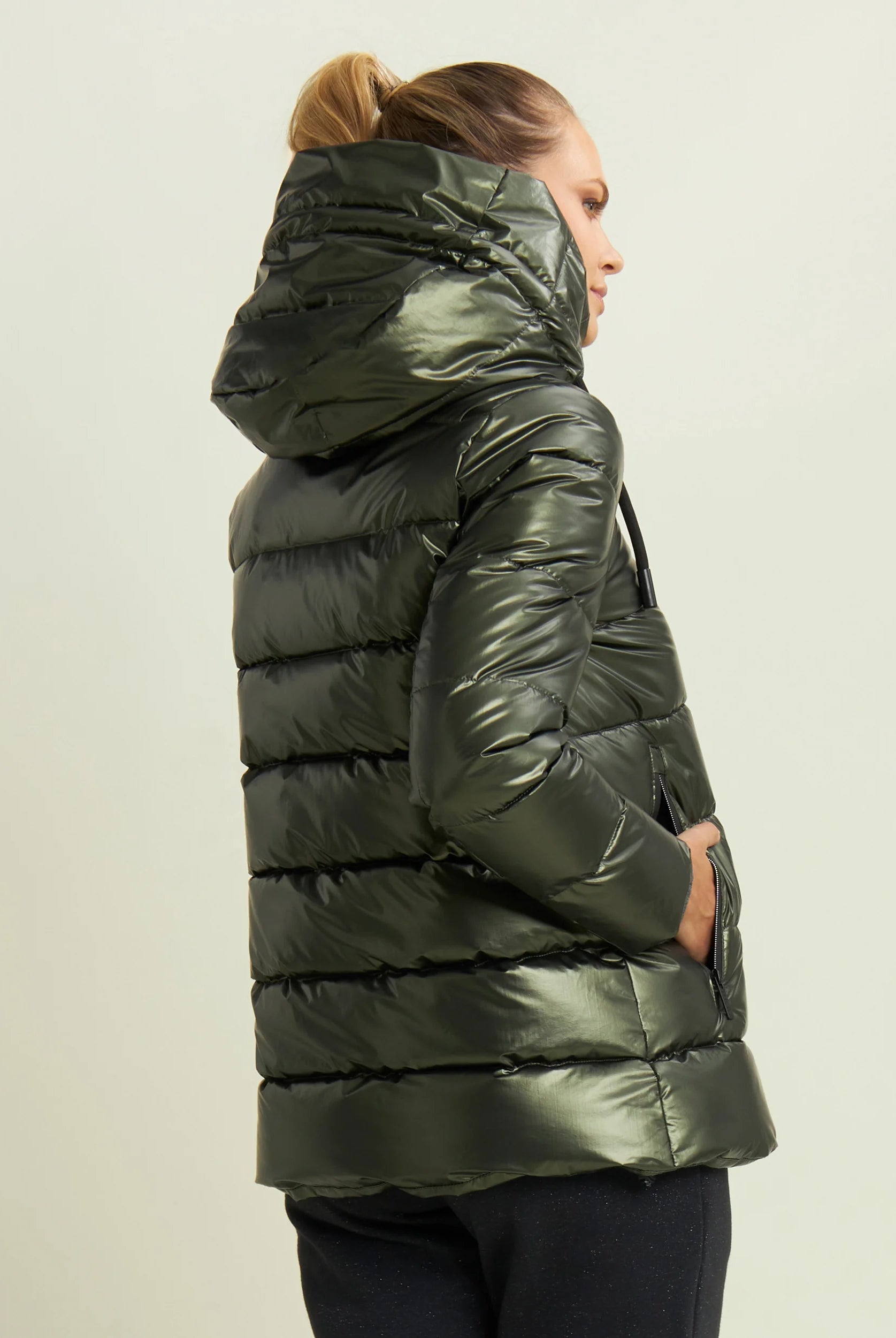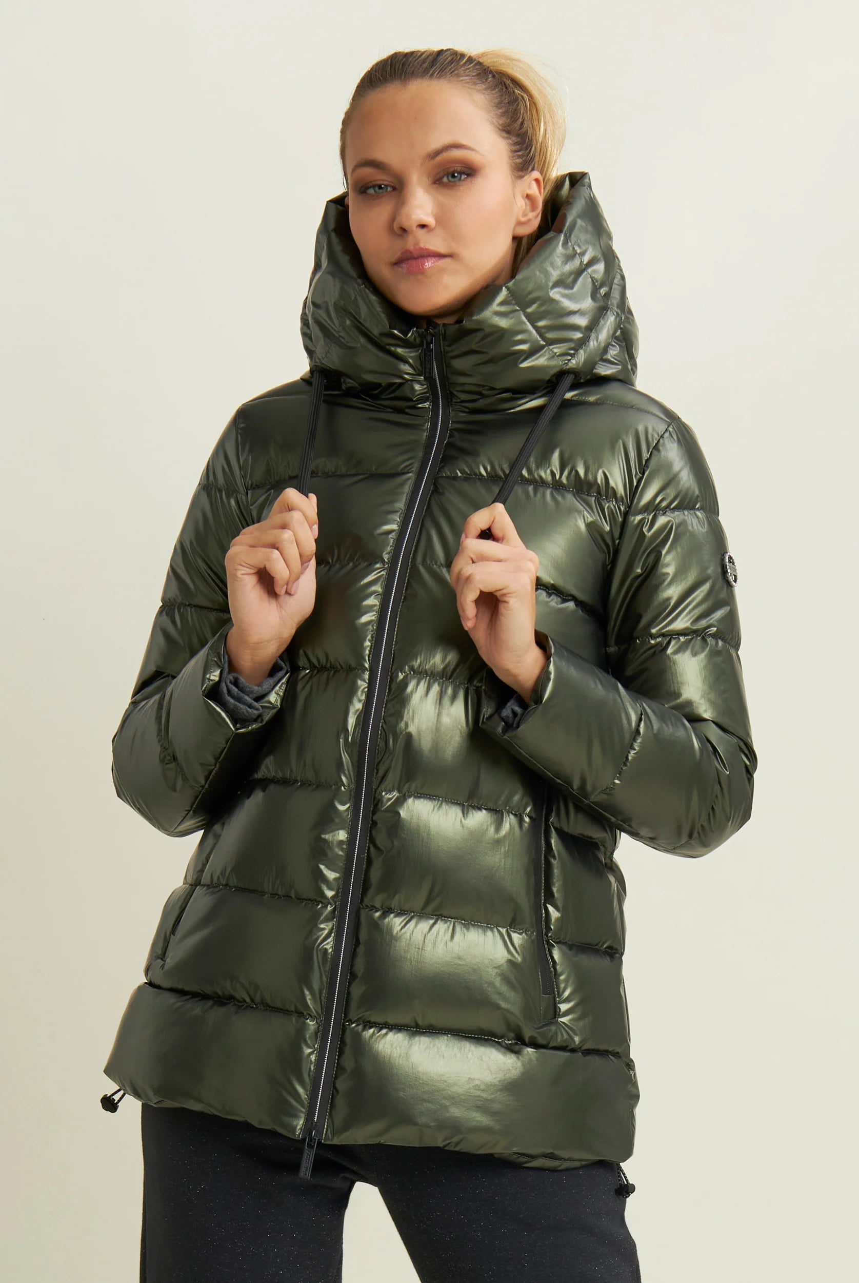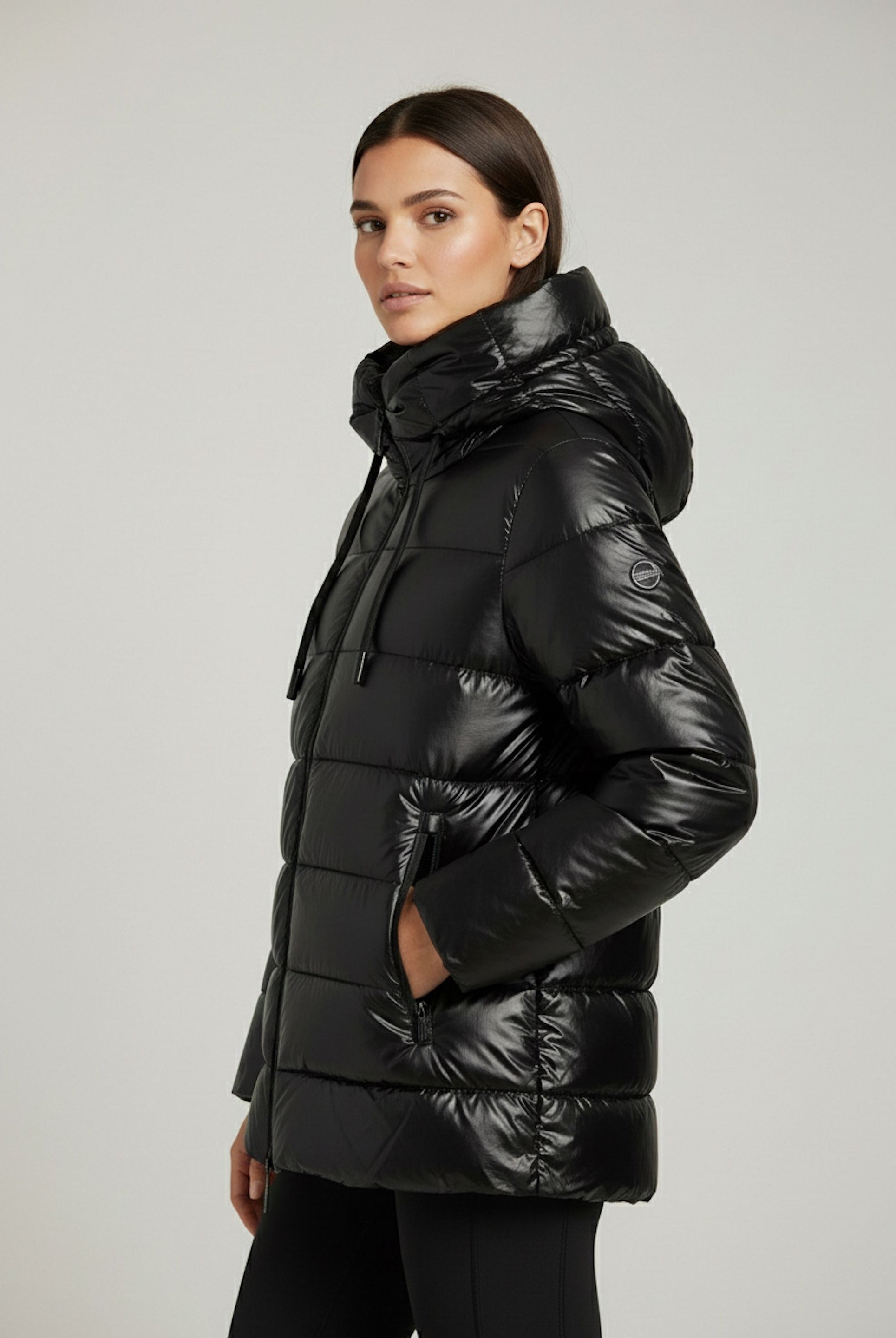 Women's glossy down jacket with protective hood and drawstring