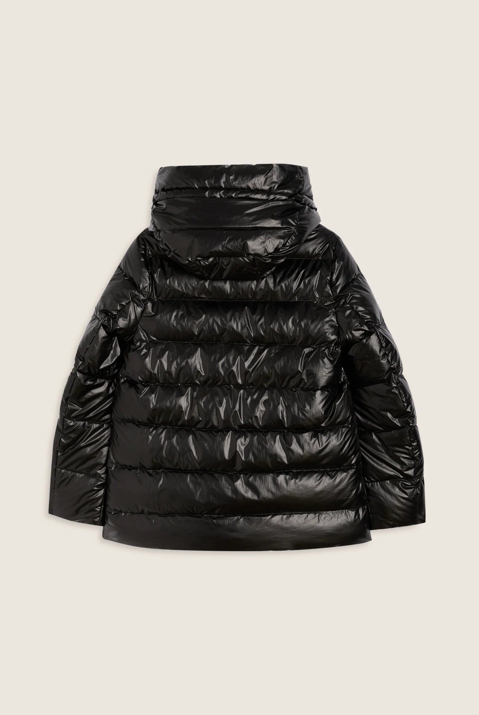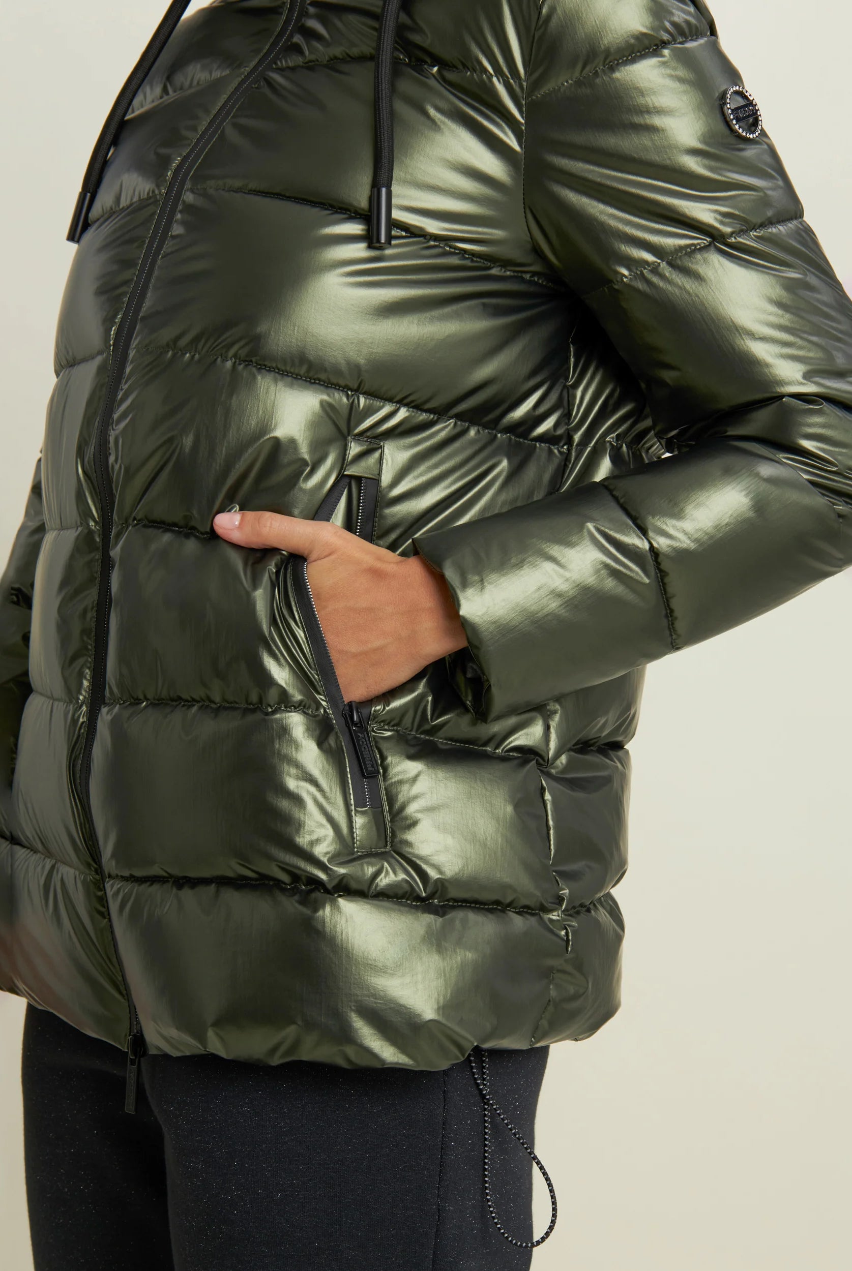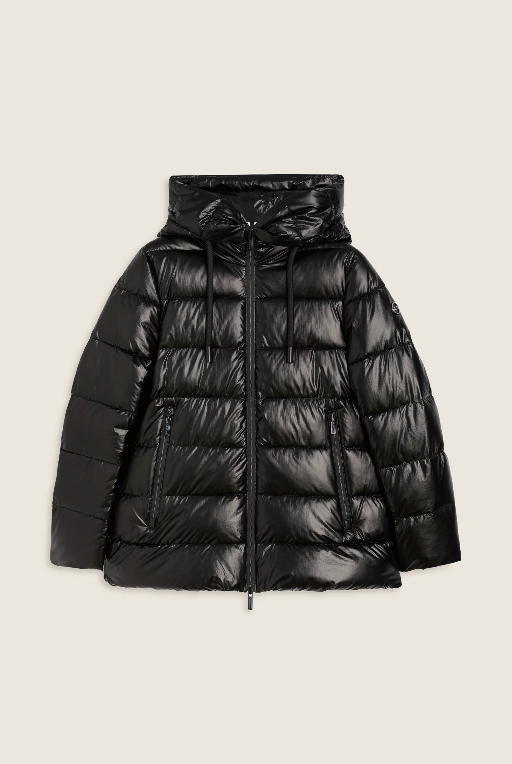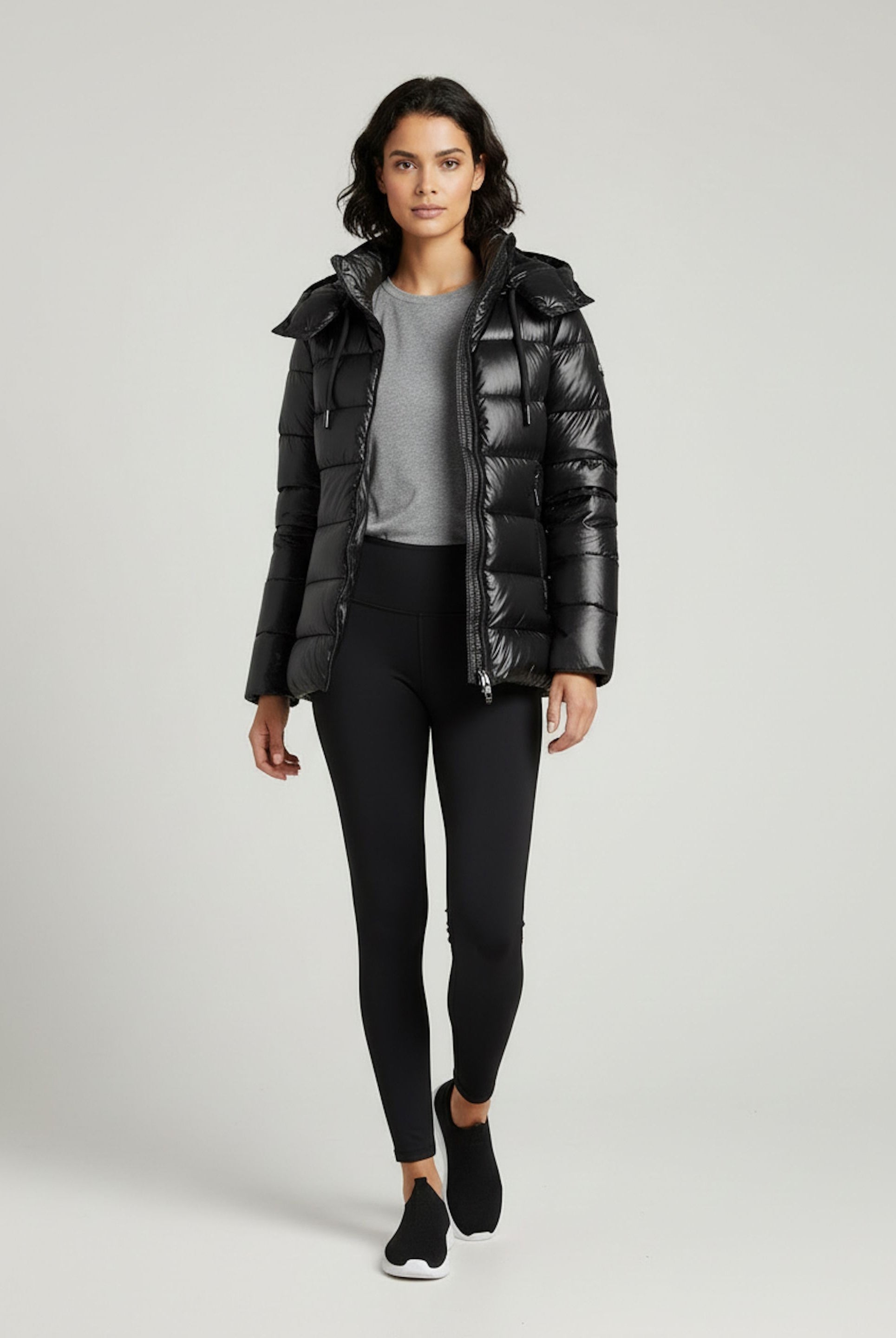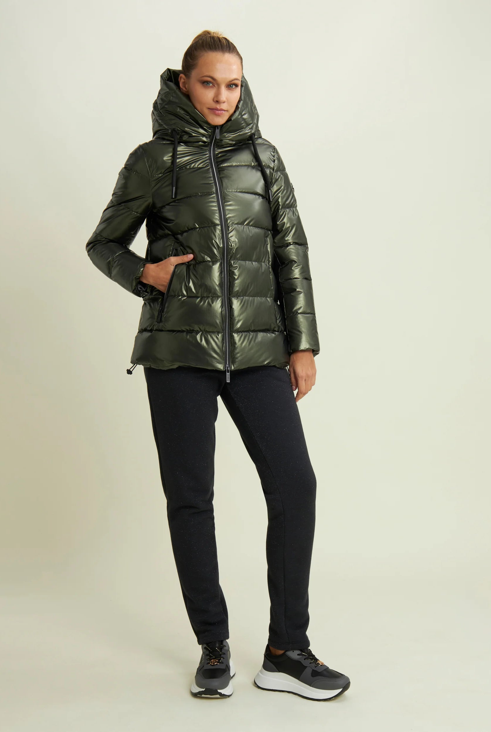 Women's glossy down jacket with protective hood and drawstring