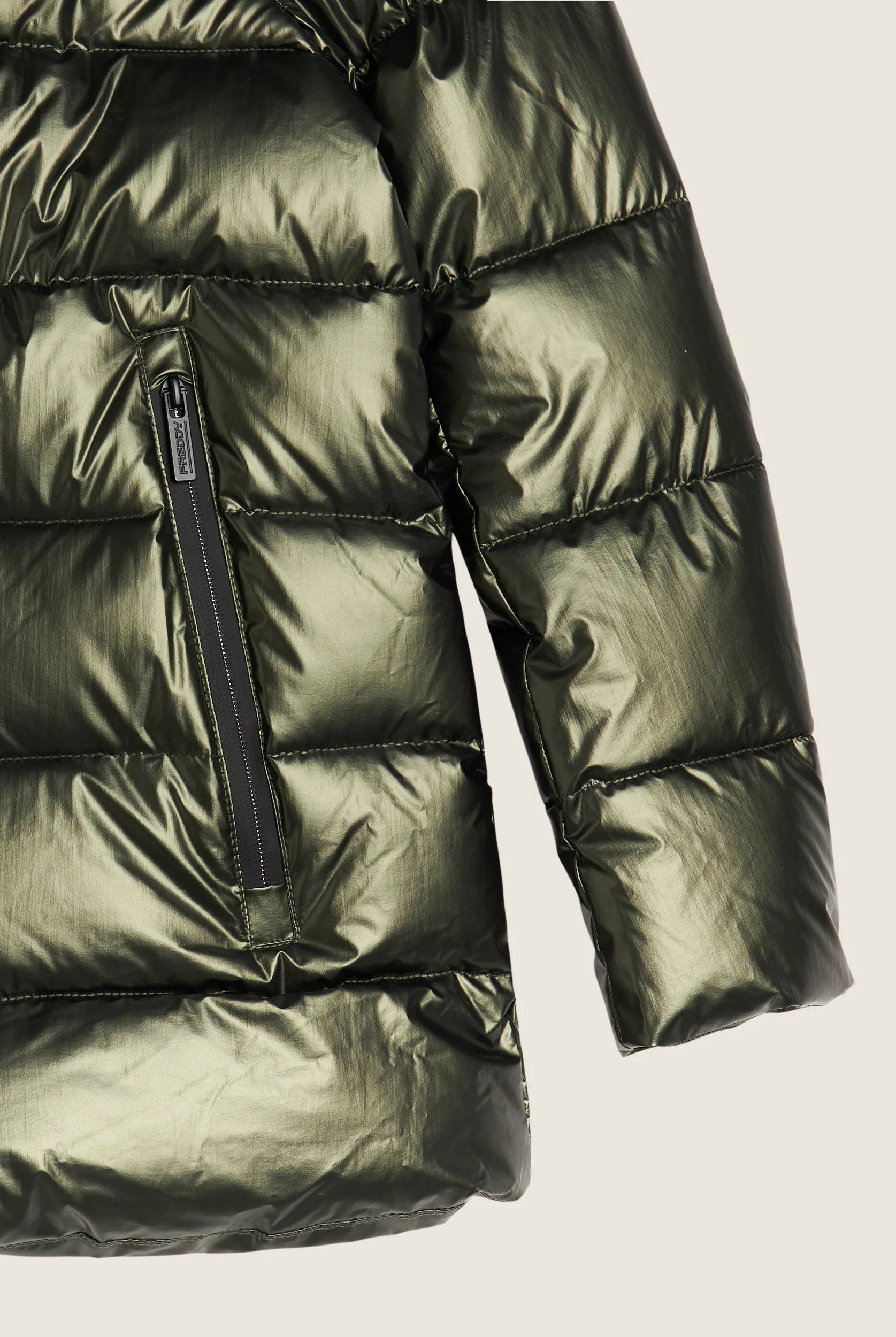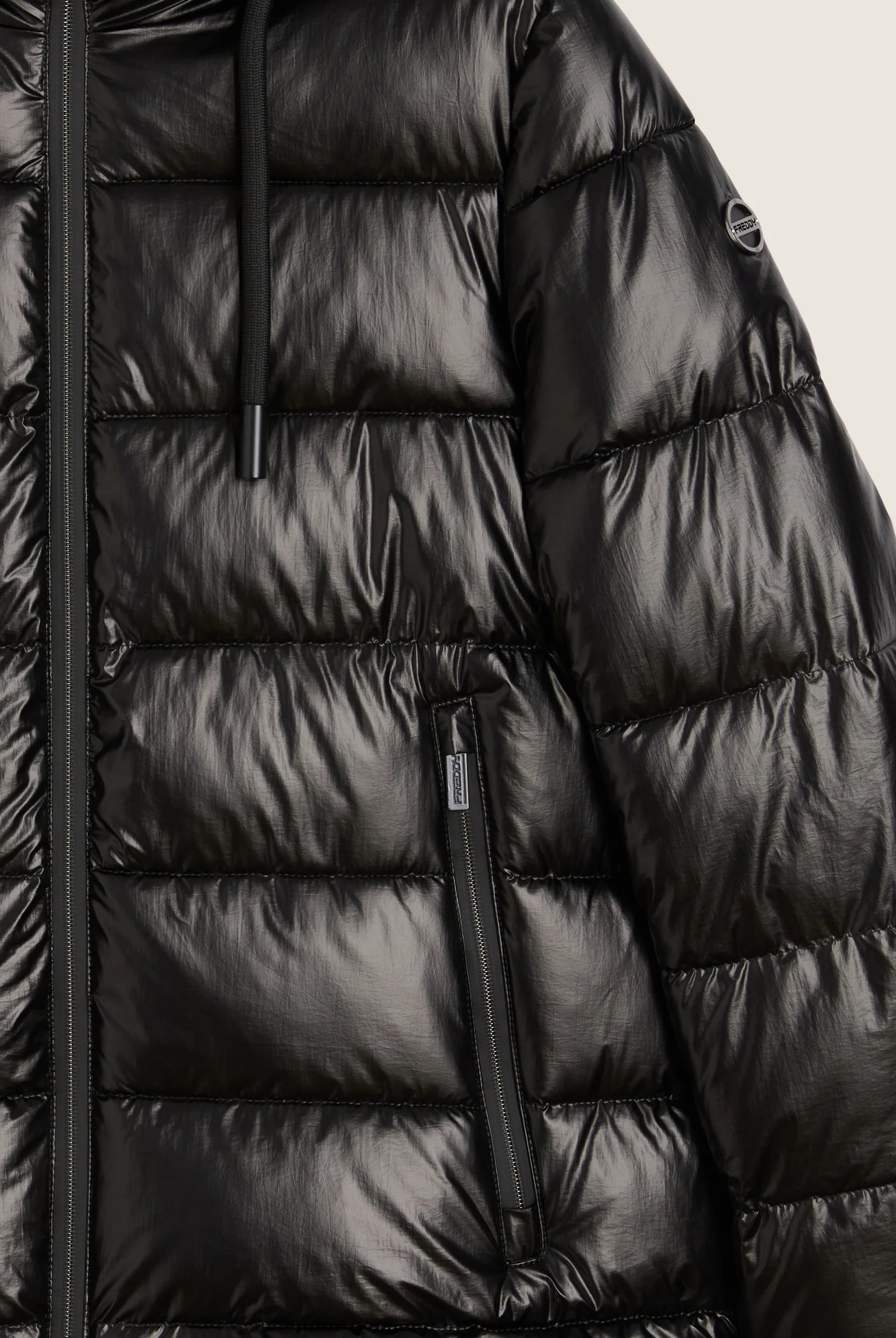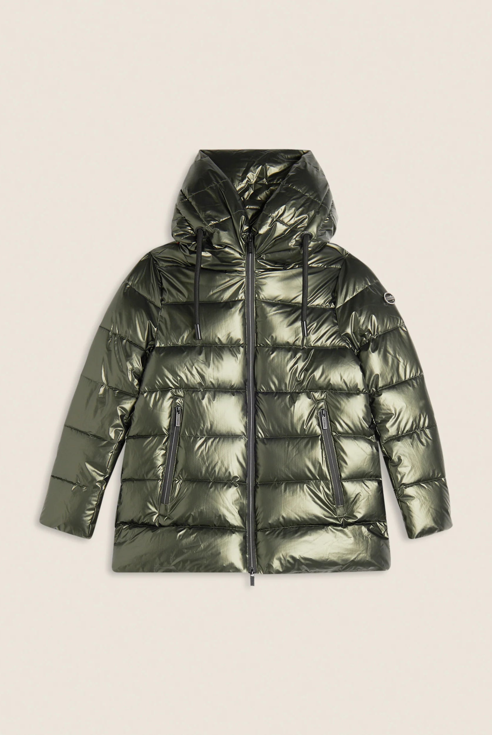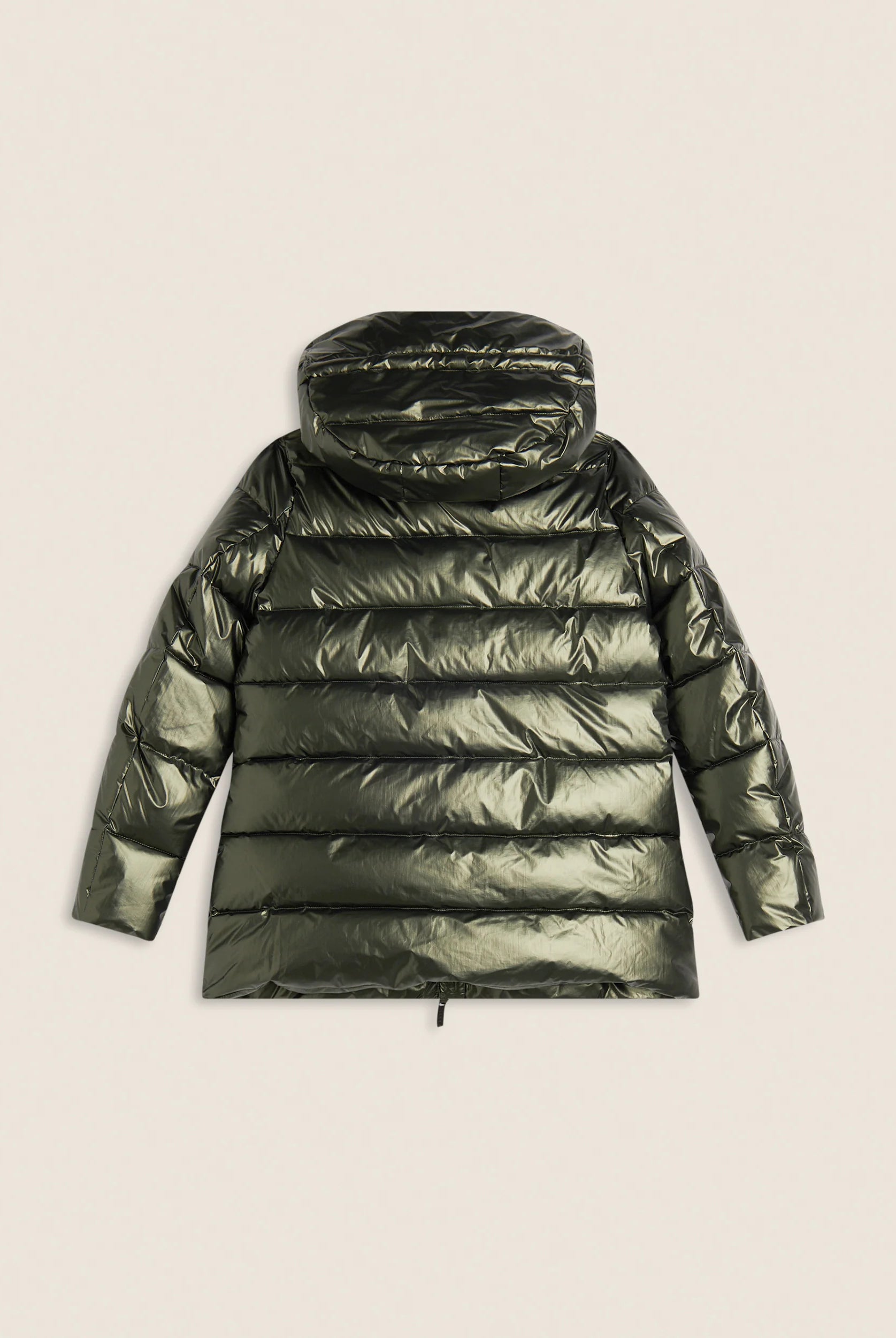 Women's glossy down jacket with protective hood and drawstring