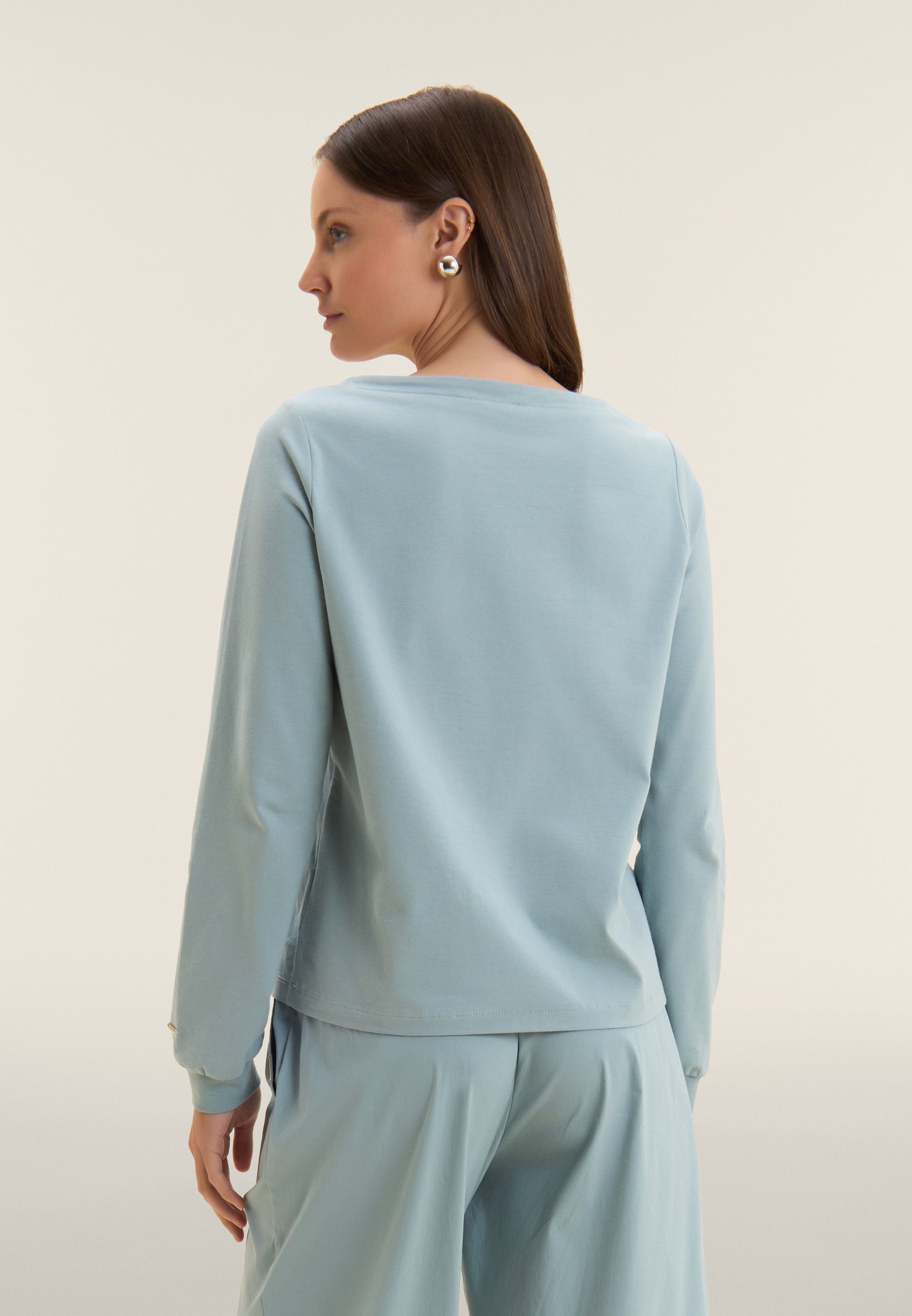 Regular-fit, standard-length sweatshirt with straight hem and boat neck. The long sleeves are finished with ribbed cuffs for a neat look. The front of the bust is in stretch poplin fabric, decorated with broderie anglaise-style floral embroidery on the side. A small embroidery logo on the heart and a golden FREDDY logo tab on the bottom left sleeve complete the elegant design. Made of heavy cotton stretch jersey, the sweatshirt is ideal for those seeking comfort and style.