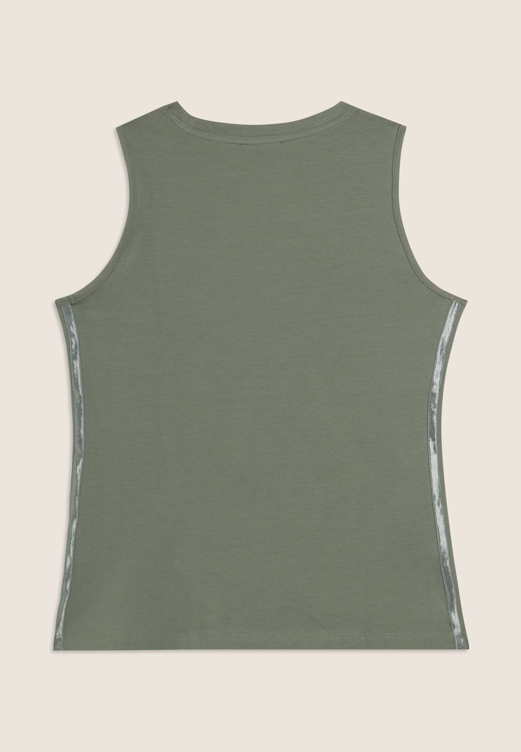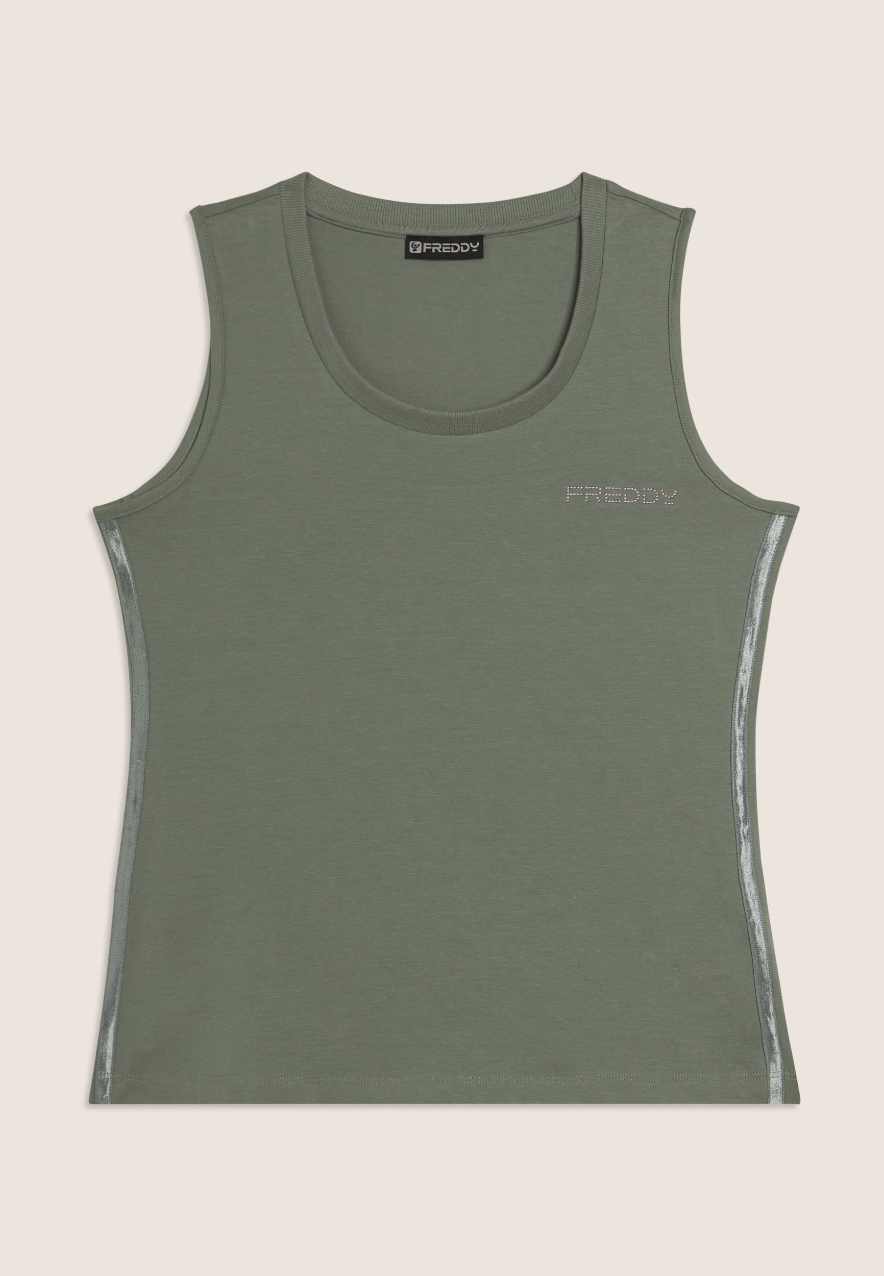 A tank top with an essential and comfortable design, with a round neckline and wide shoulder straps. The regular fit and straight bottom ensure a comfortable fit. The FREDDY logo in light pink beads on the heart and the shiny elastic side inserts decorate with elegance. Perfect for light activities, it is made of lightweight stretch cotton jersey.