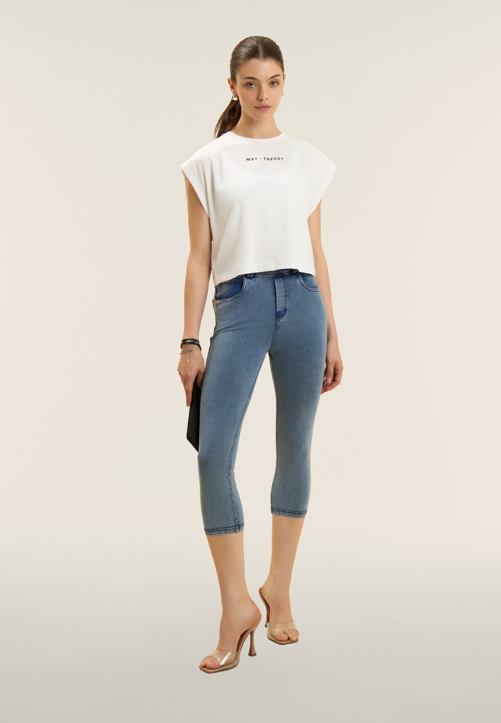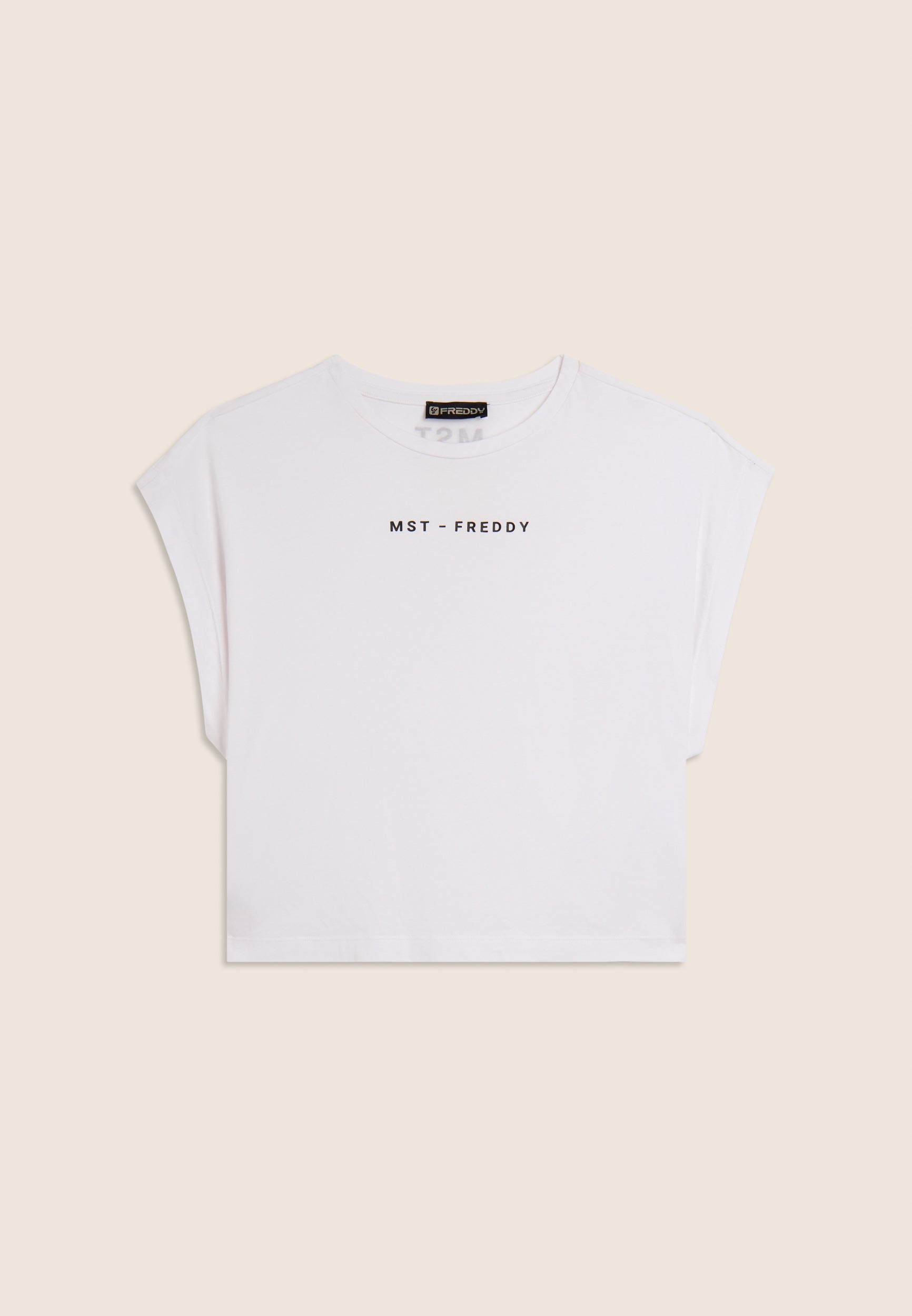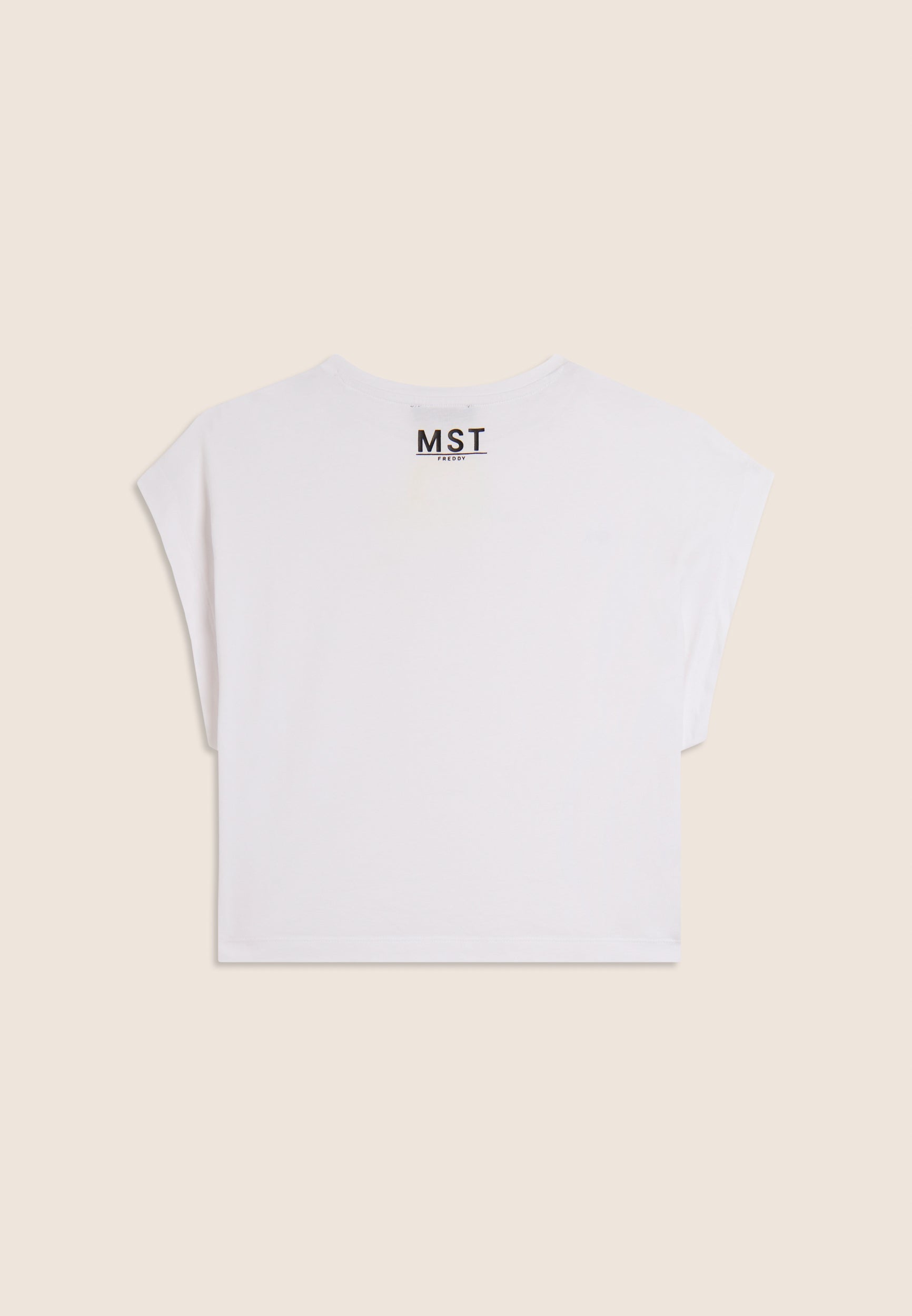 Short sleeve t-shirt with comfortable fit and cropped length, made of stretch cotton jersey, which guarantees a soft and comfortable fit. The straight bottom and very short cap sleeves create a casual yet sophisticated look. Small MST FREDDY prints on the chest and under the back neckline add a distinctive touch. A versatile garment, ideal for a simple yet elegant look, perfectly suited to both leisure and sporty outfits.