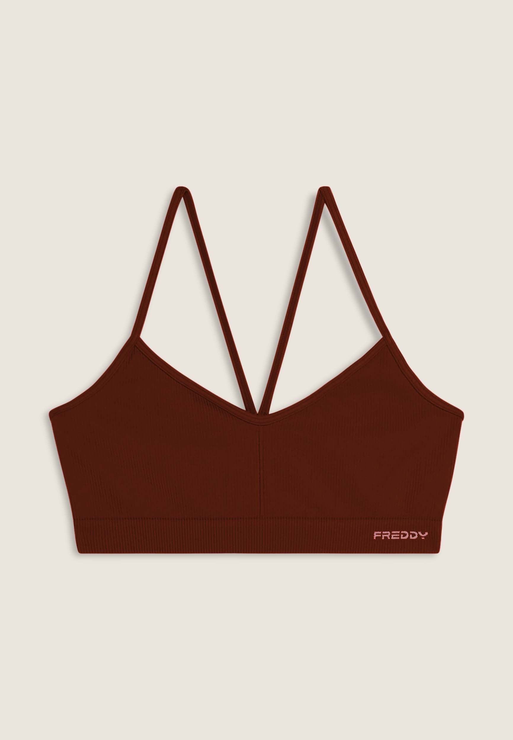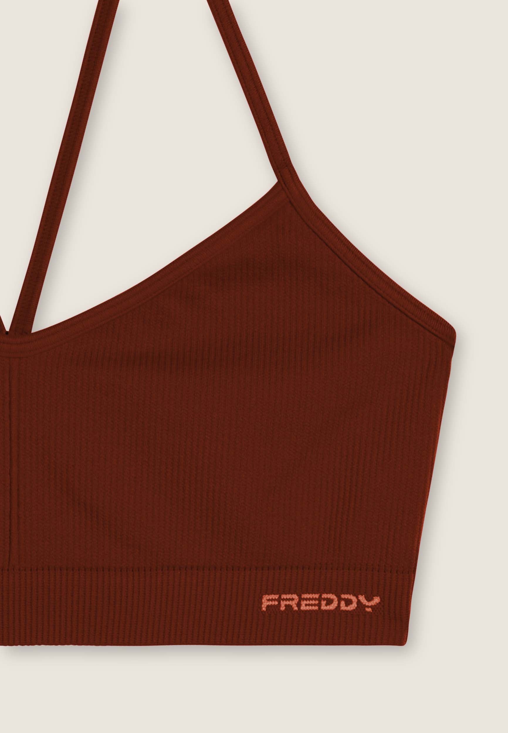 Medium support sports bra, ideal for variable intensity training. Made from seamless ribbed fabric, it seamlessly follows the contours of the body to provide total comfort. The design includes a wide neckline and thin shoulder straps crossed at the back, with a small FREDDY jacquard logo on the underbust band.