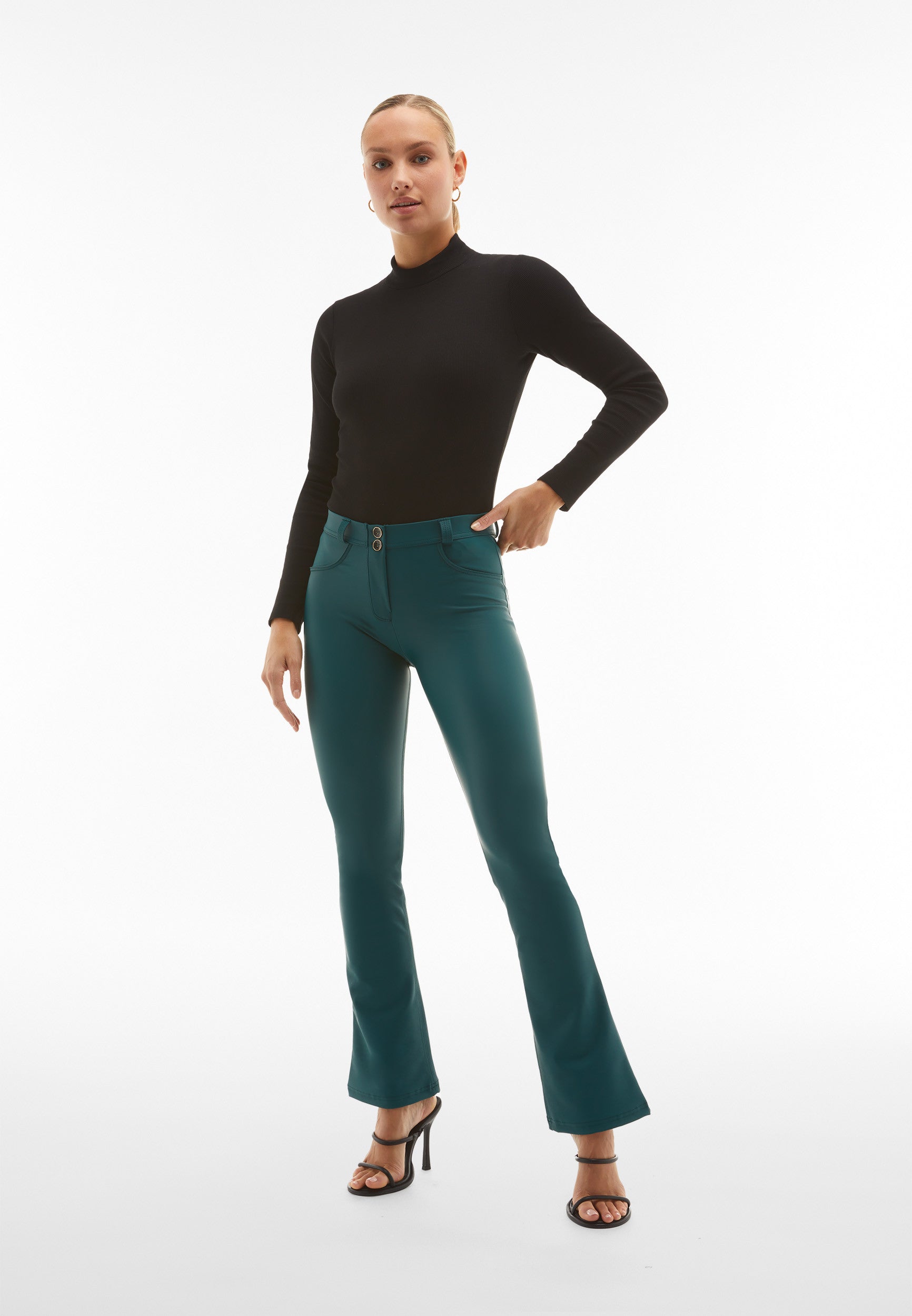 WR.UP® Sport Pants in Green: designed to flatter and move with you. It combines with a trendy mini flare for a subtle retro touch. Adding to that is a comfortable mid waist for everyday ease. The look is completed by a timeless full length, perfect for any season. Crafted made with a faux leather material that combines style and ease of movement and engineered with DIWO® fabric, designed to wick away sweat and keep you comfortable during exercise. As part of the WR.UP® line, they feature patented technology designed to naturally enhance and sculpt your silhouette. Your go-to piece for days when you just want to feel great.