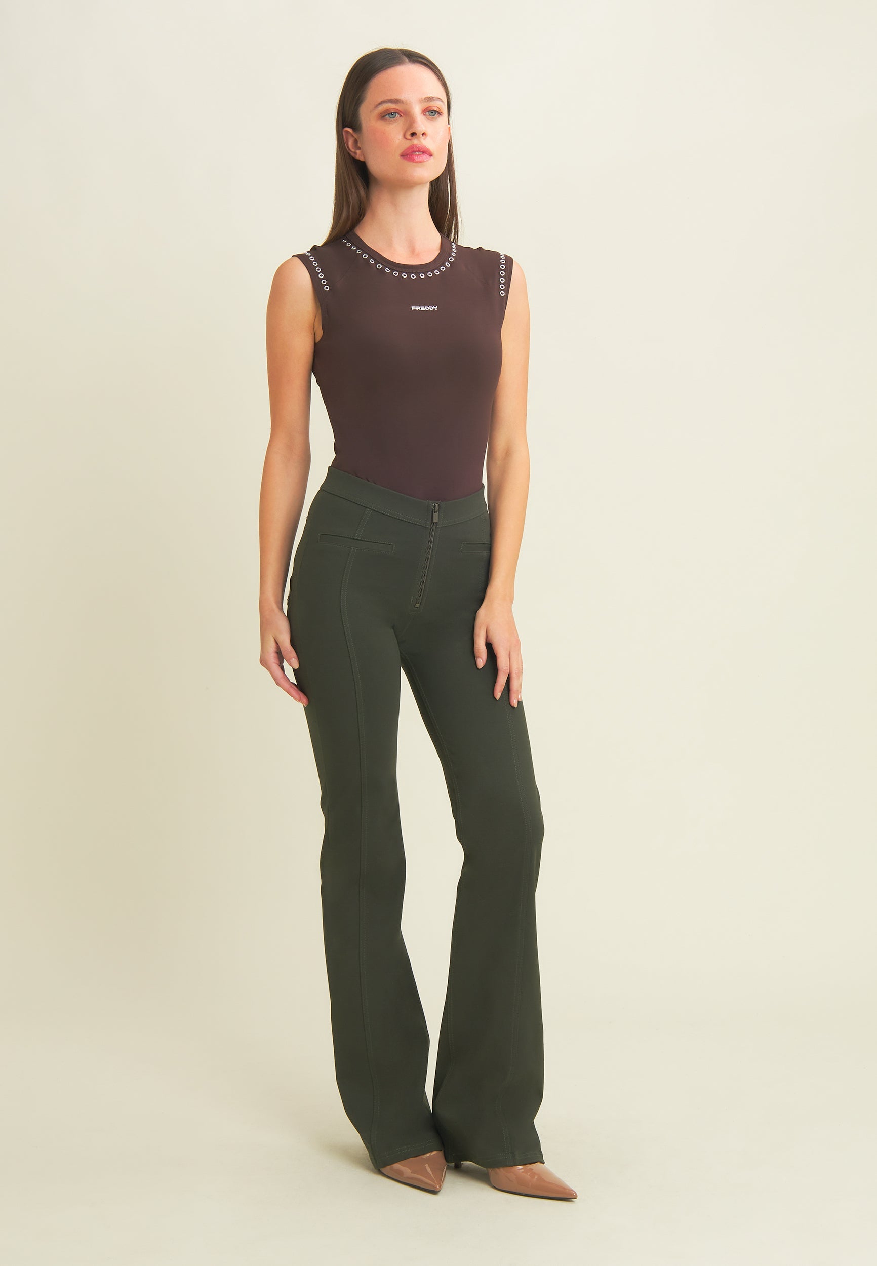Die Mid-Waist-Modelle sitzen zwischen der Taille und dem Bauchnabel. Alle unsere mittlere Jeans haben vorne drei Freddy-typische Knöpfe. Sie sind etwas höher als unsere Regular-Waist-Hosen, aber nicht ganz so hoch, wie die High-Waist-Modelle. Sie haben einen bequemen, hohen Bund ohne Silikonstreifen, und die Knöpfe sorgen für einen perfekten Sitz. Jeans in Mid Waist eignen sich vor allem für kurvigere Frauen, die mehr Stütze und Form für den Bauch und die Taille möchten. Zusätzlich zaubern die Hosen natürlich den perfekten Po.