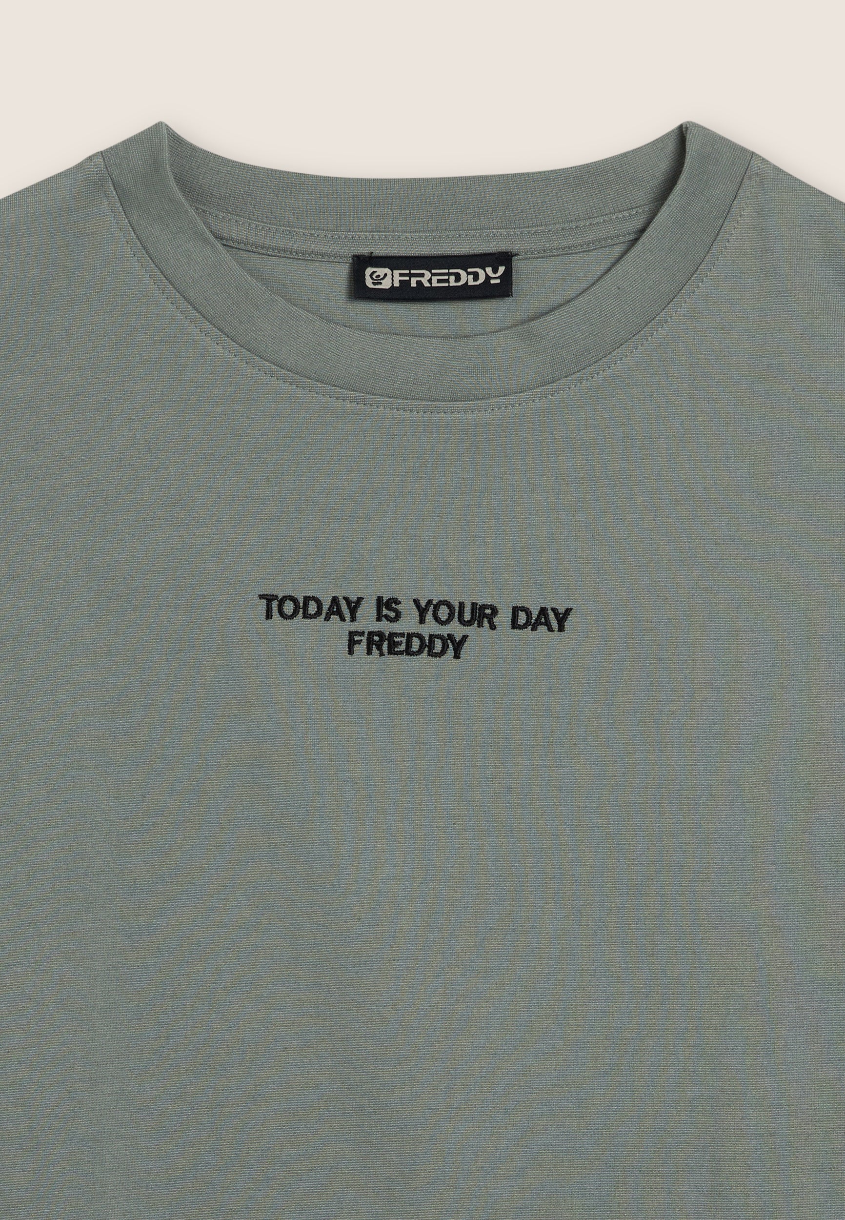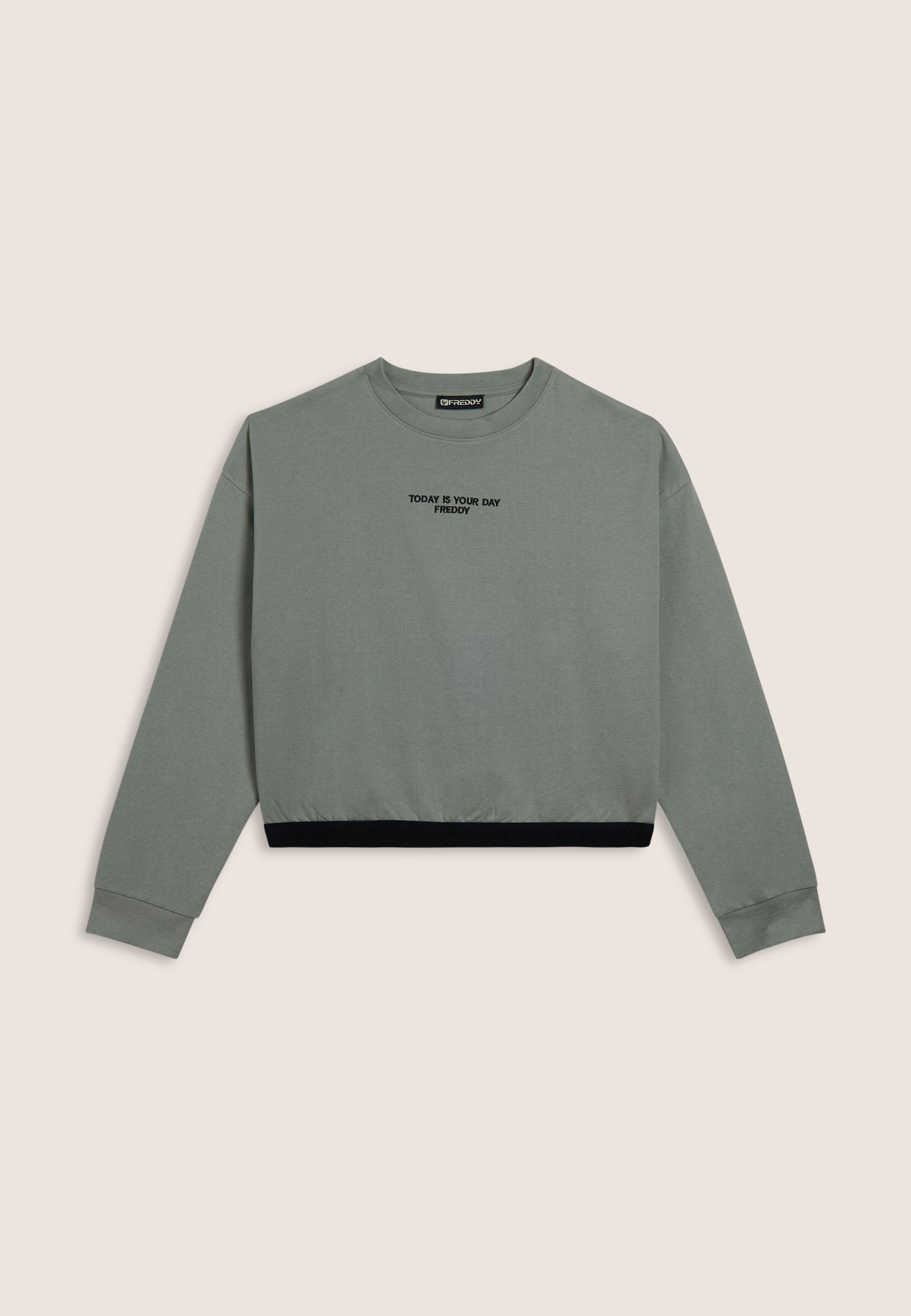 Women's sweatshirt in stretch brushed fleece, comfort fit and bottom with logoed jacquard band. The “TODAY IS YOUR DAY” embroidery with FREDDY logo decorates the centre of the chest.