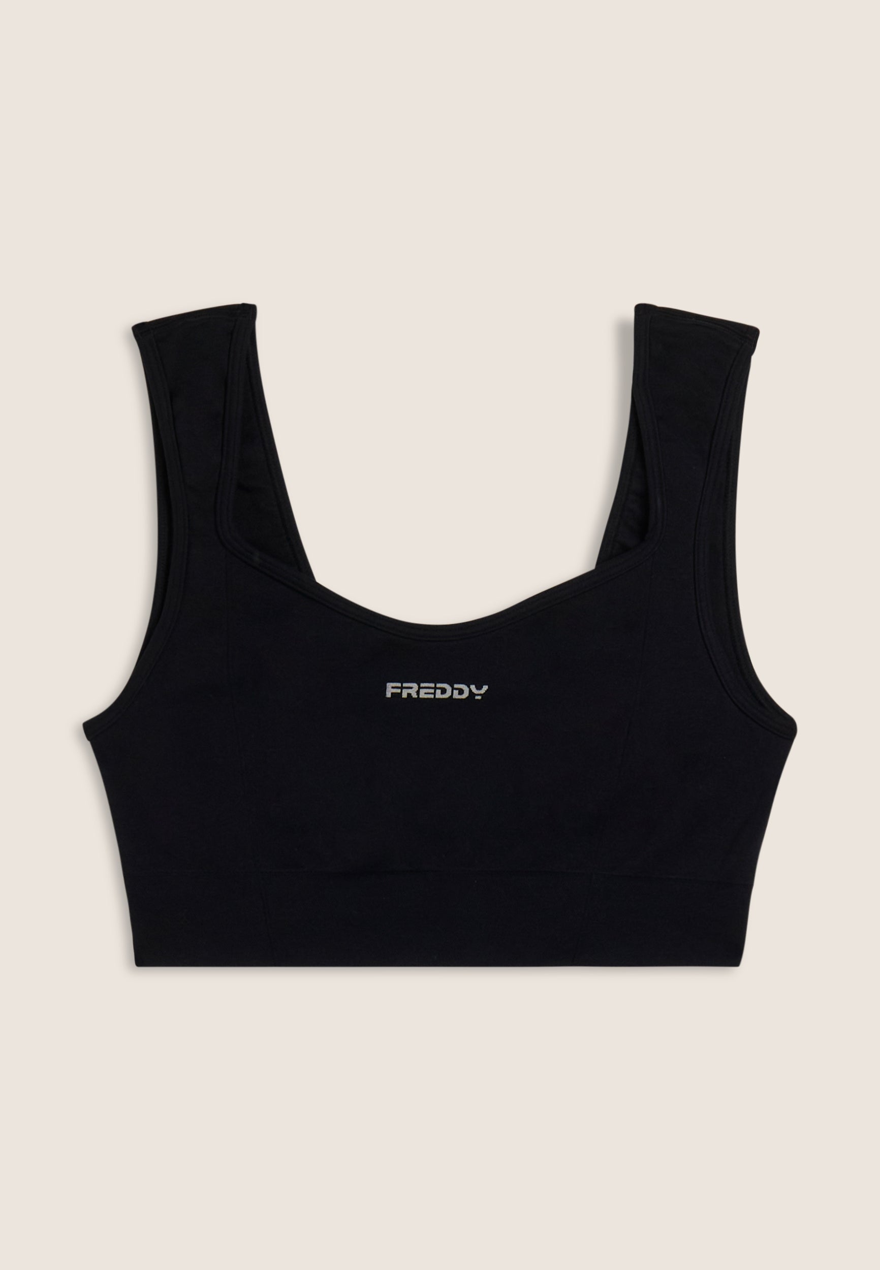 Ar savu sievišķīgo un ērtu dizainu šis vieglais atbalsta sporta tops ir ideāls jogai un zemas intensitātes aktivitātēm. Priekšpusē ir sirds formas izgriezums, bet aizmugurē kvadrātveida izgriezums ar regulārām plecu lencēm. Neilona džersija izpildes audums ir mīksts, elpojošs un viegls, ar nelielu FREDDY kontrastējošu logotipu priekšpusē.