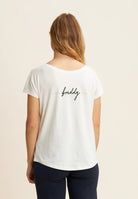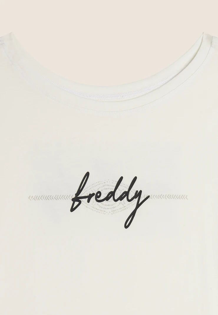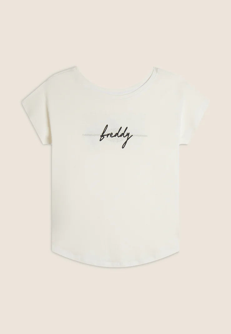 Short-sleeved t-shirt in supima cotton jersey, appreciated for its softness and strength. The comfort fit, rounded hem and cap sleeves make it ideal for a casual but smart look. Complete with large graphic with “Seize The Day” slogan and FREDDY logo with small decoration, it offers a choice of which graphic to wear on the front or back.