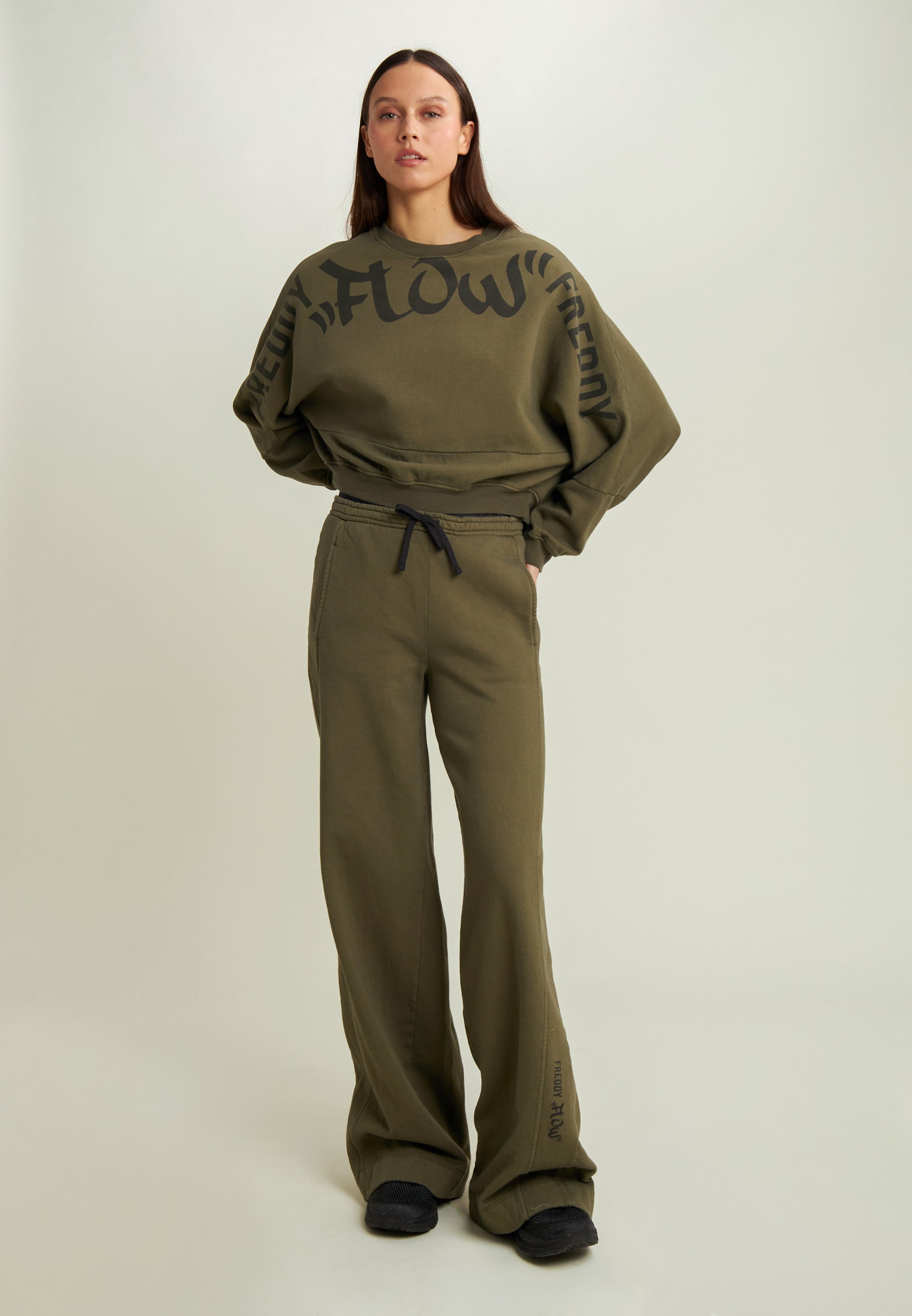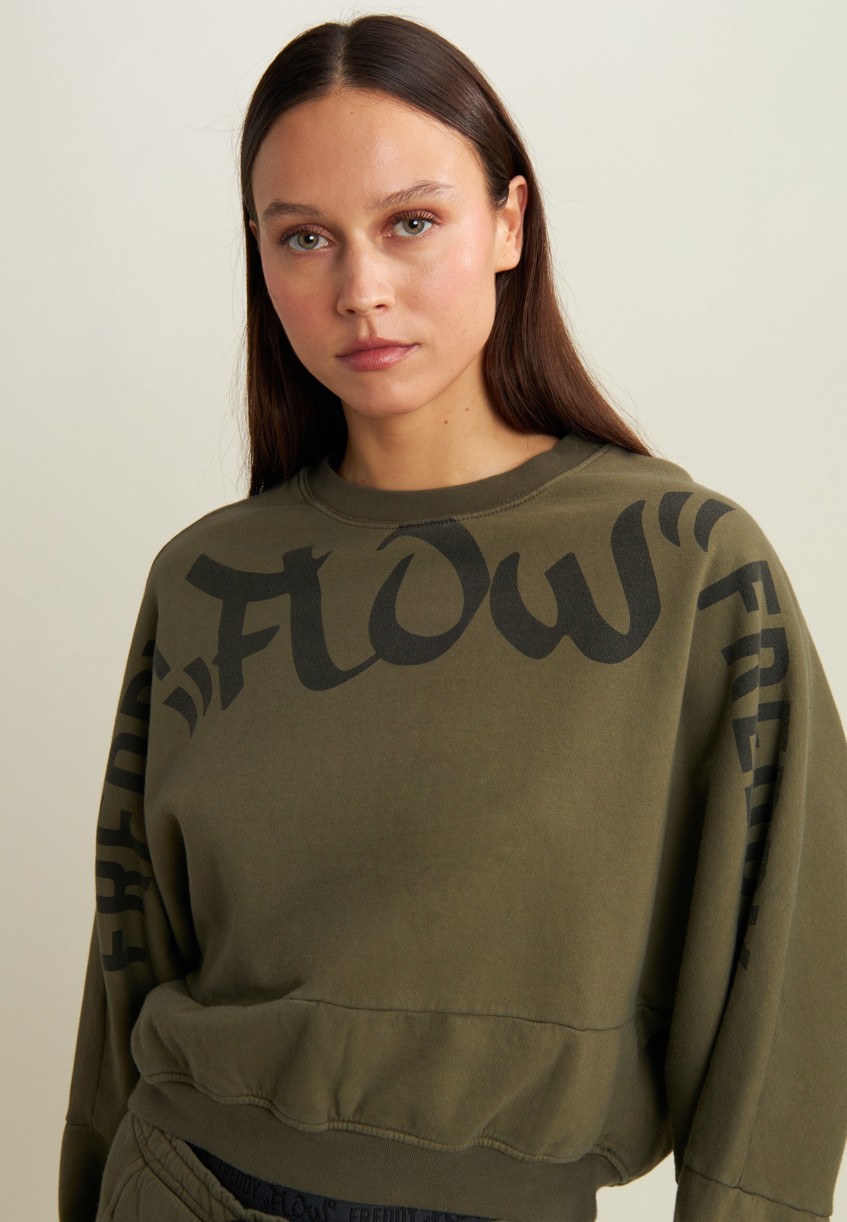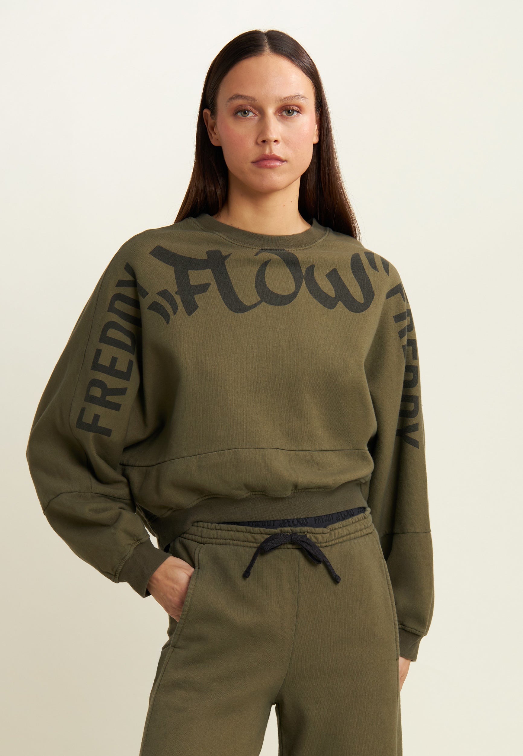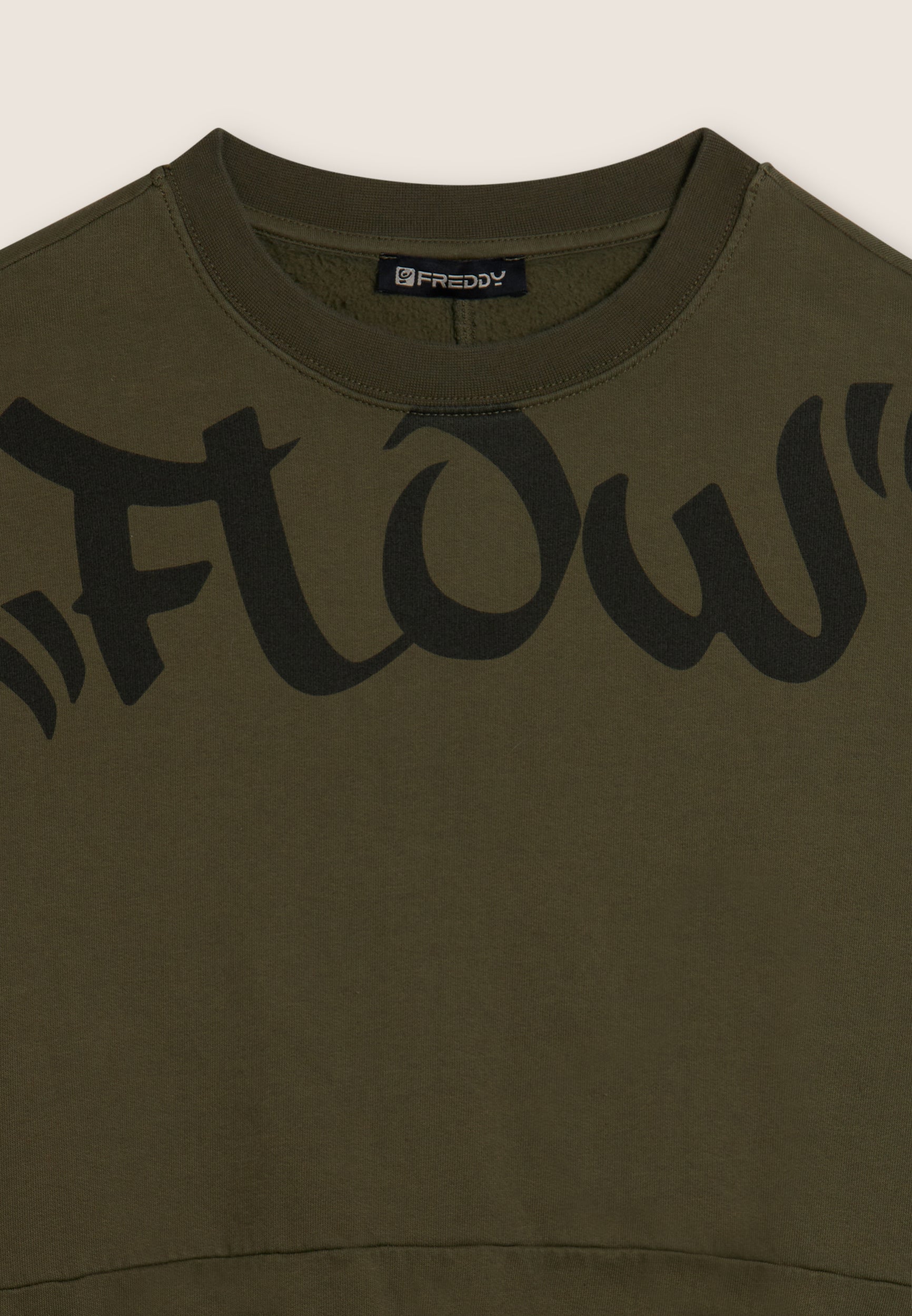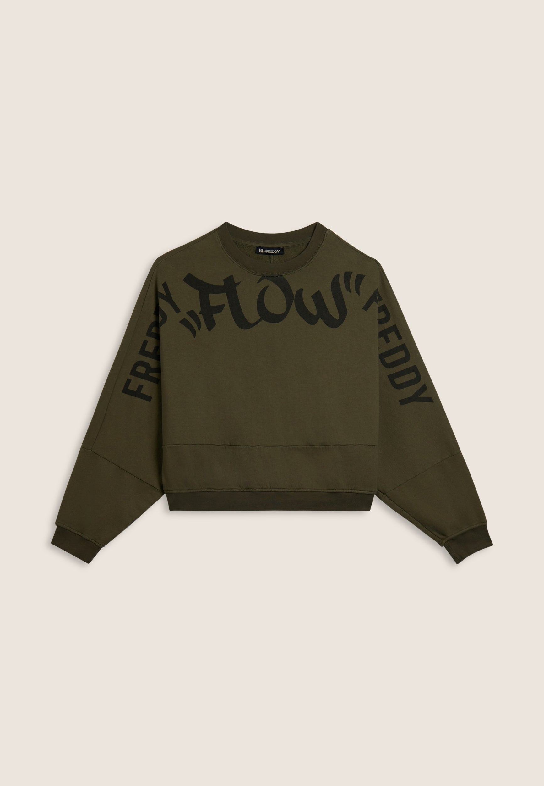 Impactful and super comfy: this oversized cropped sweatshirt does not go unnoticed thanks to the central “Flow” print and the large FREDDY logos running across the shoulders and sleeves. The brushed, enzyme-treated fabric makes the garment warm, soft and intensely coloured. Short cut, dropped shoulders and ribbed finish for a casual, urban look, perfect for matching with balloon or cargo trousers.