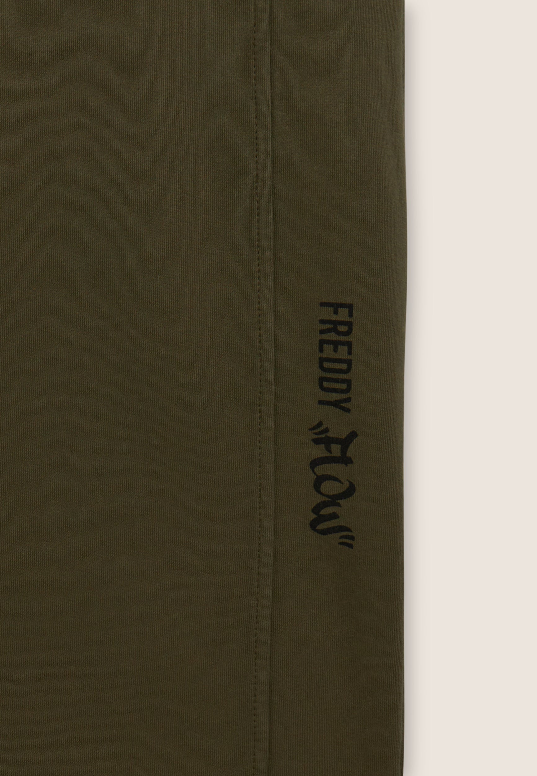 Wide leg and street details for these brushed fleece trousers. The “Flow” print with FREDDY logo on the side of the leg gives an artistic and original touch, while the logoed jacquard elastic waistband and drawstring ensure a comfortable fit. Intense colours and softness are guaranteed by the enzyme treatment: the must-have for a comfortable and trendy look.