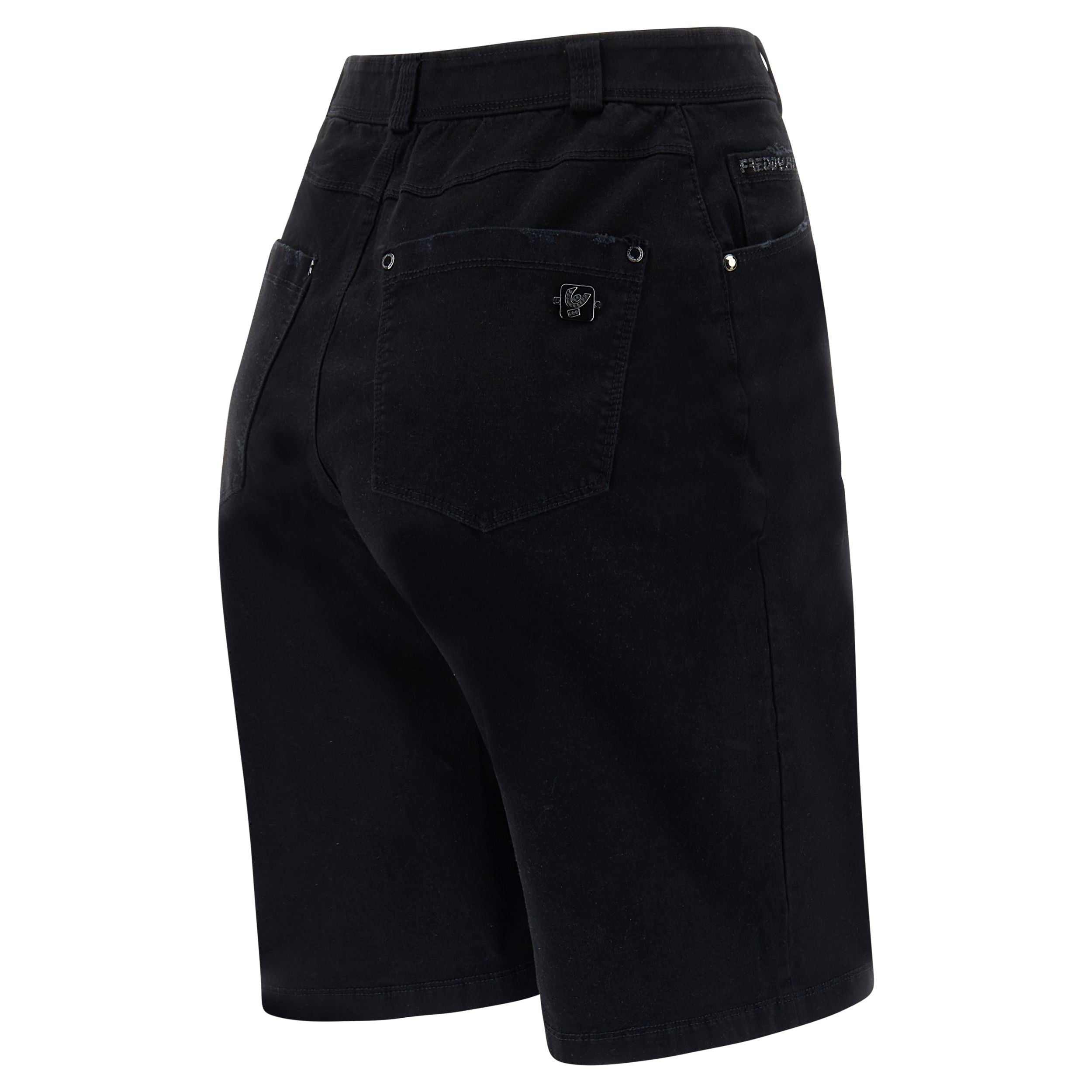 Fit Jeans Shorts in Black: designed to flatter and move with you. This piece impresses with a fresh shorts cut for sunny days and active moments. Adding to that is a comfortable mid waist for everyday ease. The look is completed by a sophisticated wide-leg palazzo style for a flowing silhouette. Crafted to offer the classic look of denim with the comfort of soft, flexible fabric. Perfect for countless occasions, from casual to chic.