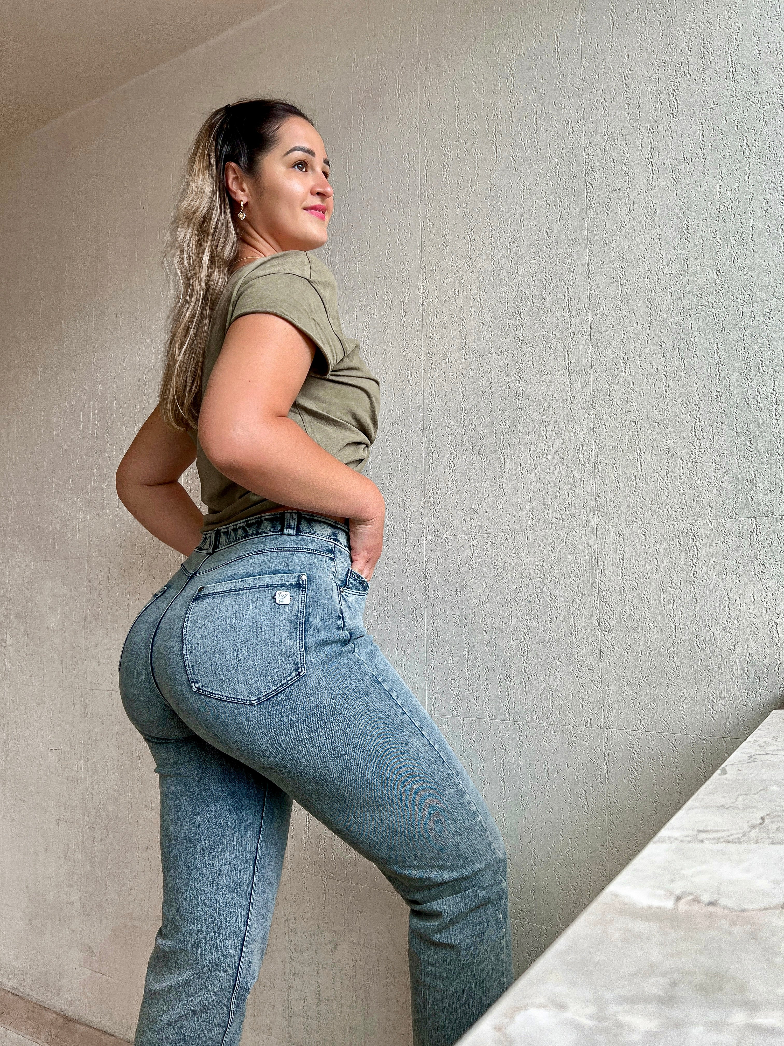 Fit Jeans Pants in Beige: designed to flatter and move with you. It combines with a sporty 3/4 length, ideal for warmer days or showing off footwear. Adding to that is a flattering high waist that offers gentle support. The look is completed by a timeless straight leg for classic versatility. Crafted combining a timeless denim aesthetic with enhanced comfort and flexibility. Perfect for countless occasions, from casual to chic.