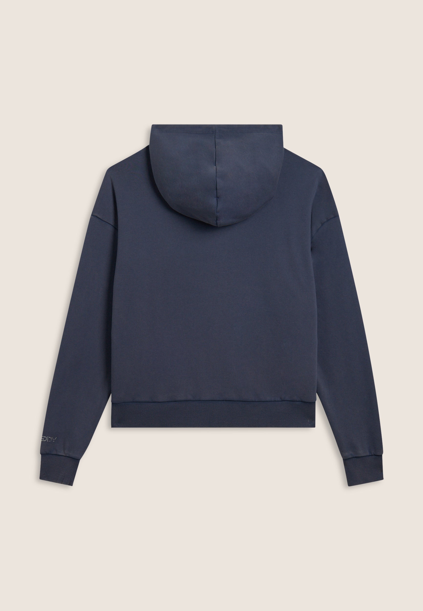 Women's comfort fit French terry sweatshirt. The jersey-lined hood is combined with dropped-shoulder sleeves and ribbed cuffs. The bottom is finished with a ribbed waistband. The large Mickey Mouse print on the front is accompanied by the small Disney logo on the back and the FREDDY logo decorated with rhinestones on the sleeve bottom. The acid wash effect gives the garment a worn look and irregular shades, making it unique.