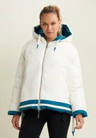 Reversible down jacket with comfort fit and hip length, ideal for creating different looks. Quilted with horizontal bands on one side and contrasting details on the other, it has animal-friendly fake-down padding to retain the heat, remaining lightweight even in wet weather. Full-zip fastening, adjustable drawstring hood and drawstring waist to adjust the fit. Front pockets with hidden snap fastening and rhinestone logo complete the versatile design.