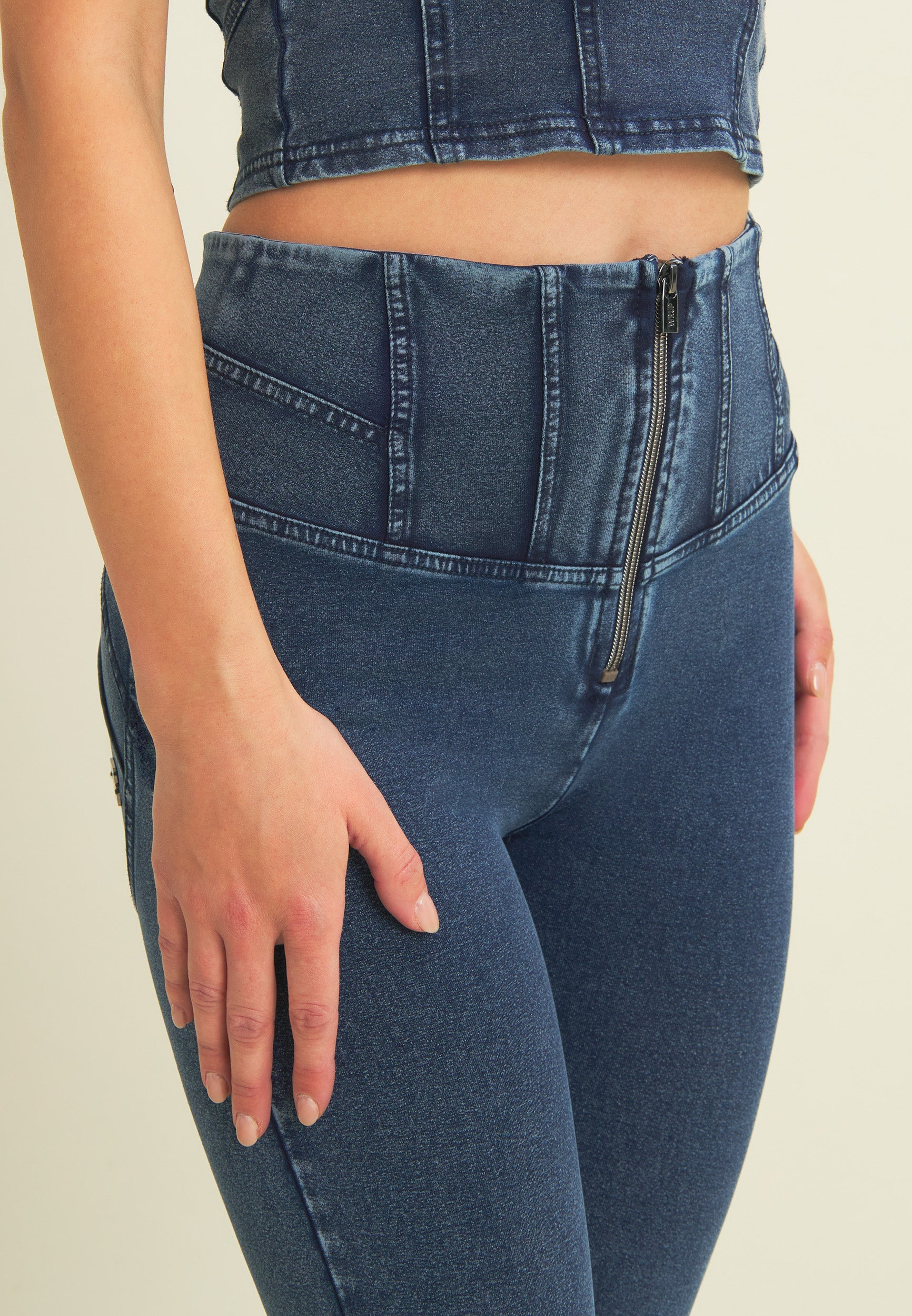 WR.UP® super skinny push-up trousers in heavy organic cotton stretch jersey with slightly worn denim effect wash. Vertical and horizontal seams emphasise the waist, creating a feminine and structured design. High waist with central zip.