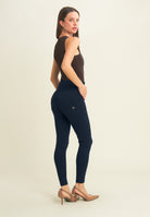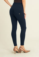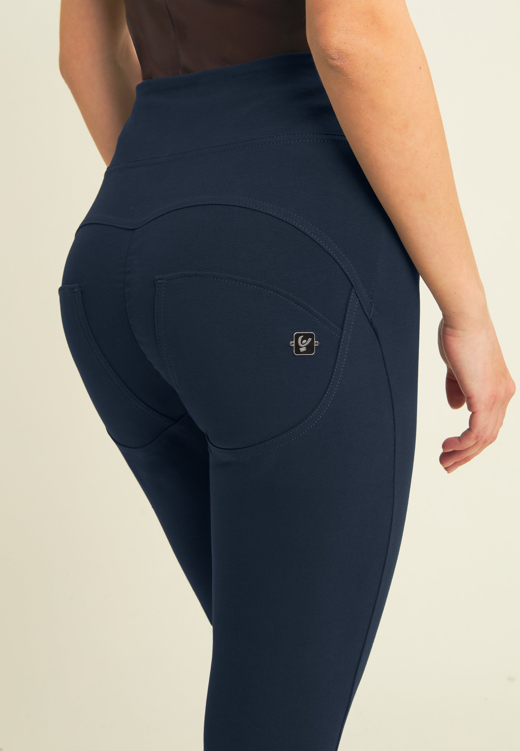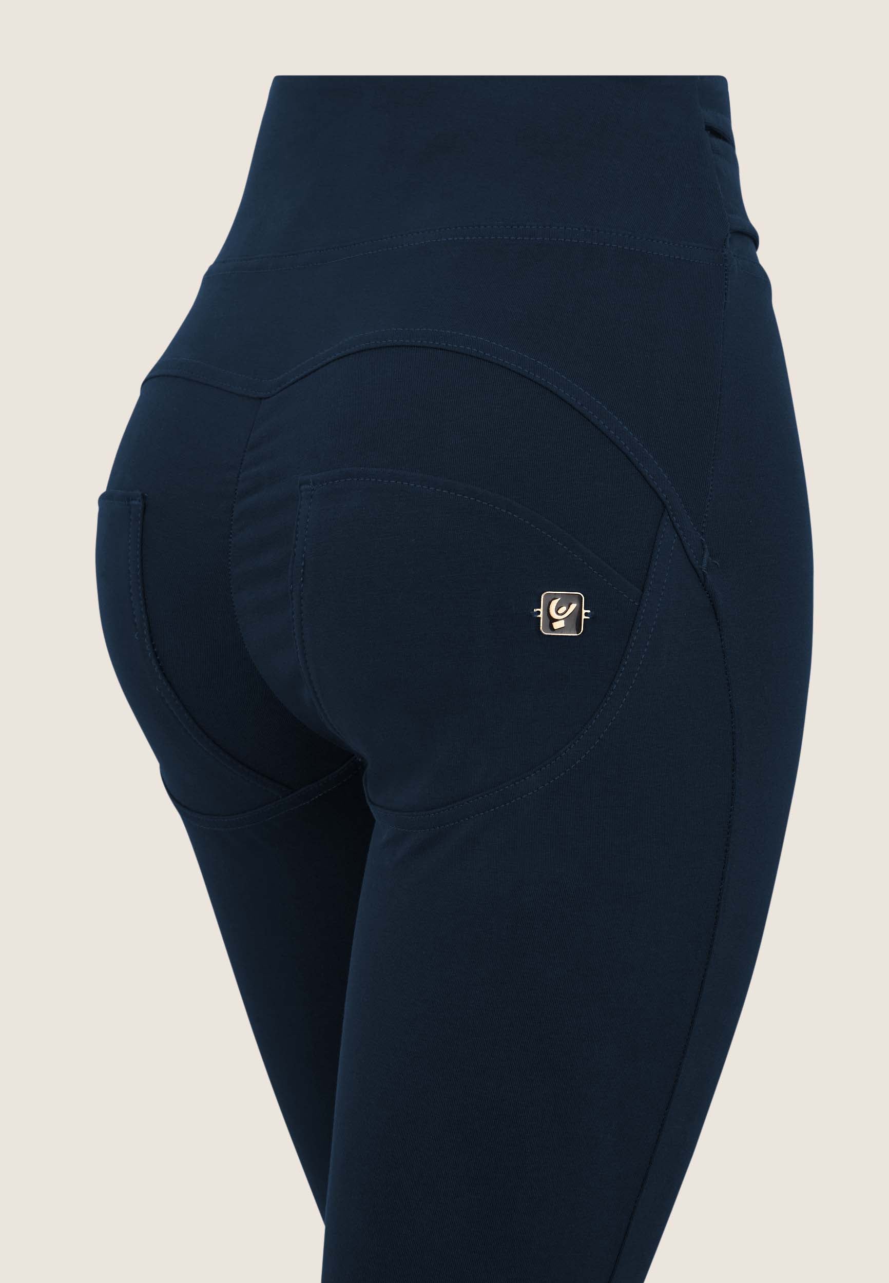 WR.UP® super skinny push-up 7/8 length trousers in heavy organic stretch cotton jersey. The decorative ribbons at the waist, fixed by large gold rivets, and the central stitching along the leg give the garment character and originality. High waist with central zip.