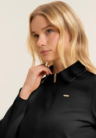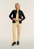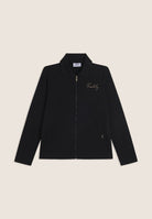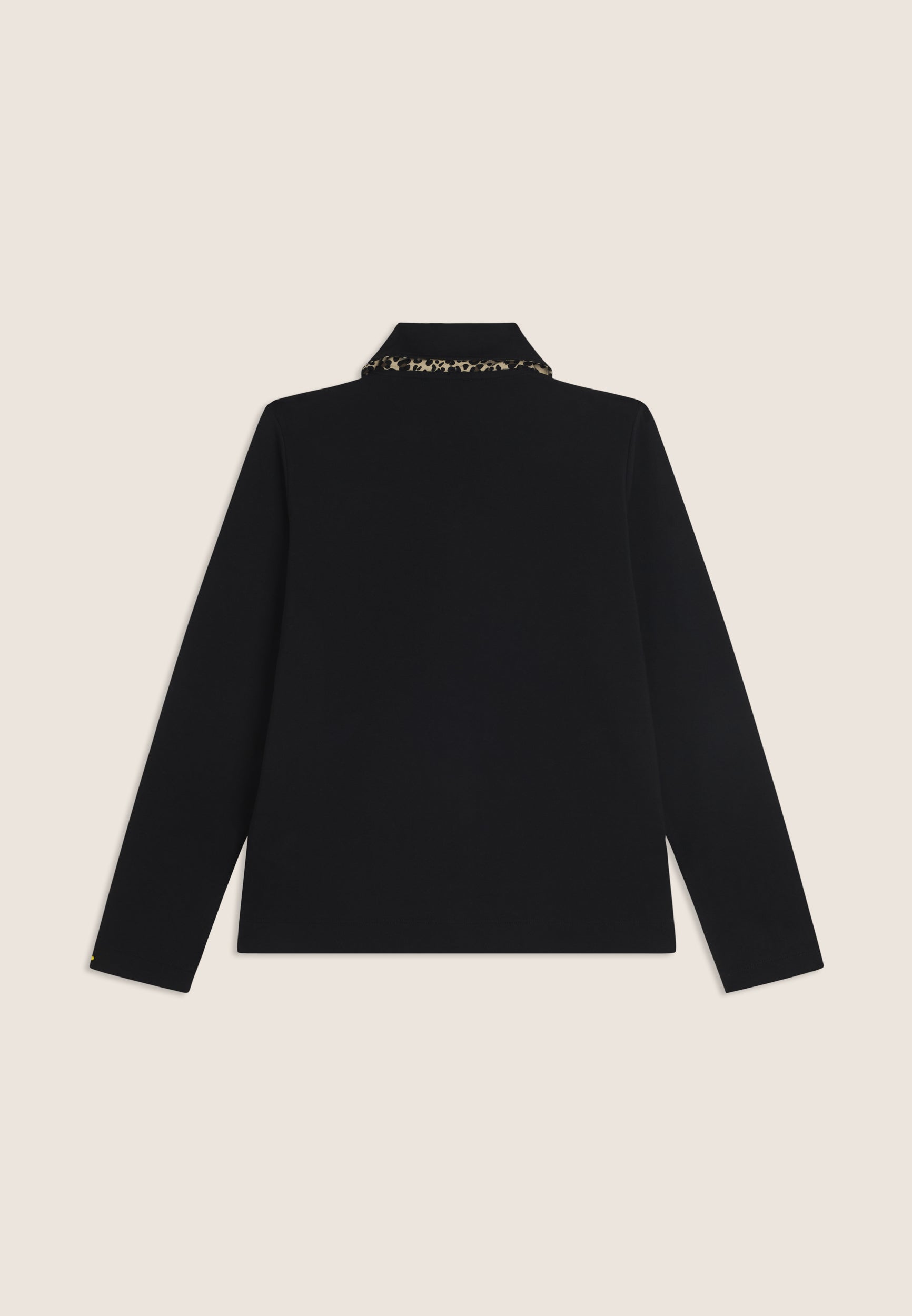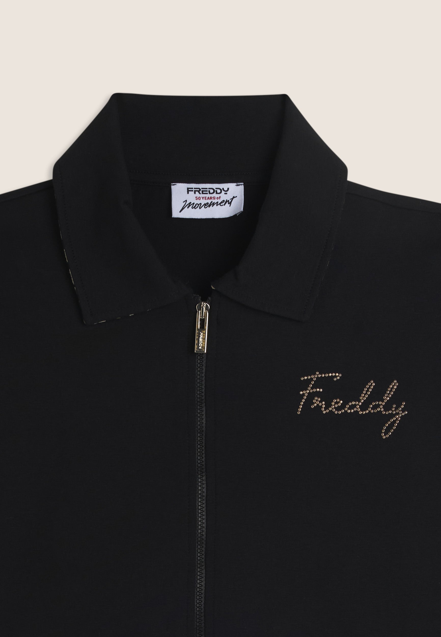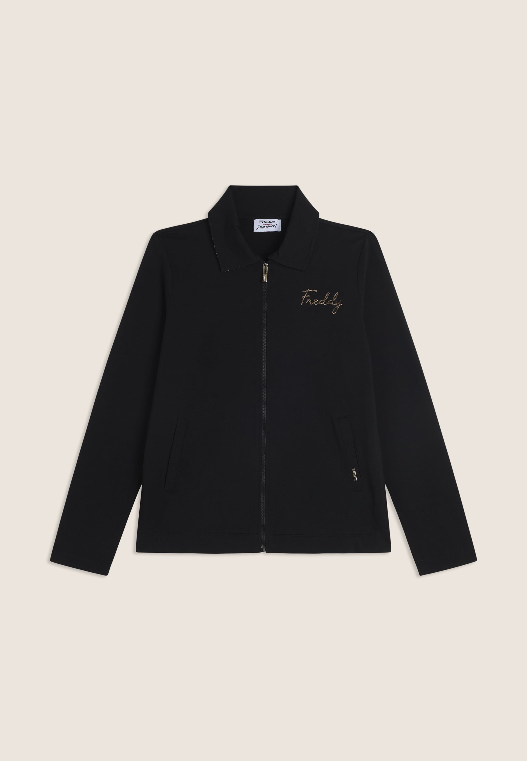 Zip sweatshirt with a regular fit and length, featuring a refined shirt collar with an animal patterned viscose bottom. Side openings at the bottom reveal a matching interior, adding a sophisticated detail. Besom pockets provide practicality and maintaining a clean and elegant line. Long sleeves without cuffs complete the essential design. The small studded Freddy logo on the heart and the golden FREDDY logo tab on the left pocket opening enrich the garment. Made of heavy cotton stretch jersey.